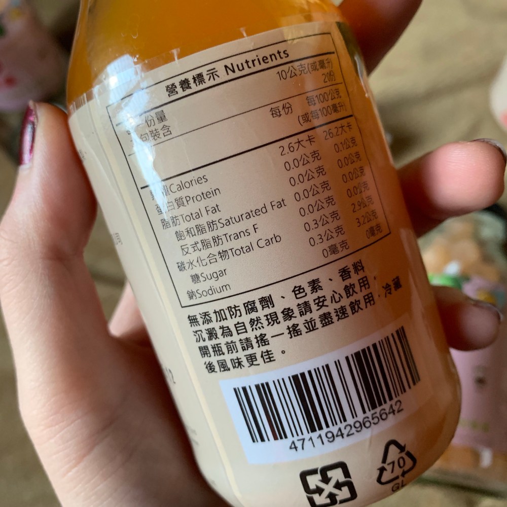 顏色是很討喜的橘色,聞起來是很自然到水果香,不想便利超商的果汁有過分的香精味,口感很清爽,現在冬天放在常溫喝也是涼爽的好入喉,微微的甜,吞入喉嚨後馬上分泌唾液,回甘的滋味讓人一口接著一口停不下來!
