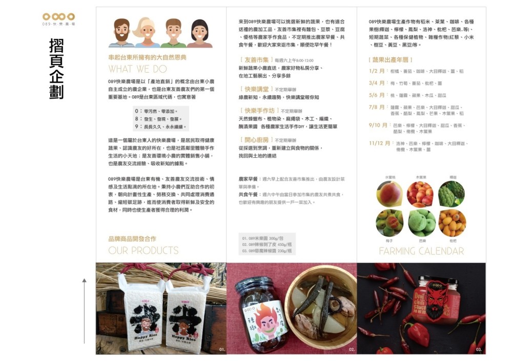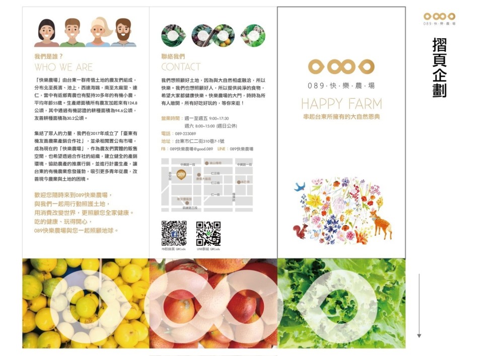 他就是來自台東的089快樂農場,由一群疼惜土地的農友組成,分佈北至長濱、池上,西達海端,南至太麻里,當中有返鄉青農也有堅持了20多年的有機小農,平均年齡落在55歲左右。在2017年成立了「臺東有機友善農業產銷合作社」,並承租閒置的公有市場,使其發展成現在的「快樂農場」,作為農友的實體販售空間,並透過合作社組織健全的產銷環境,協助農產推廣行銷,並進行計劃生產,目的是讓太多的有機農業越發蓬勃,從而吸引更多青年從農,改善現金農業與土地的困境