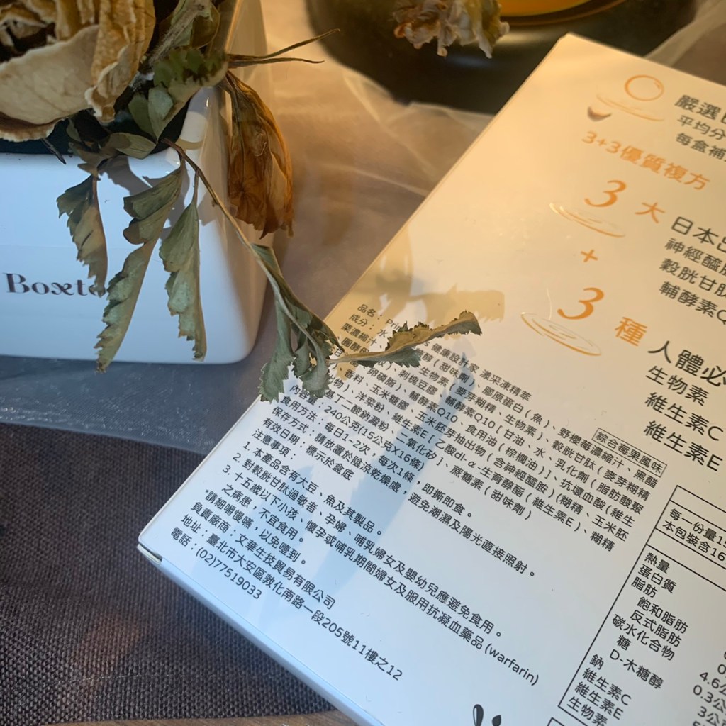 除了是莓果口味的膠原蛋白凍條以外,我會選擇健康設計家Prime Plus的漾采凍精萃,還有一個原因,因為他是複方搭配的成分,也就是我不只可以補充膠原蛋白,還可以補充人體必要維生素:生物素、維生素C、維生素E;以及神經醯胺、穀胱甘肽跟Q10,分別可以滋潤美顏、維持活力跟促進新陳代謝,維生素E更可以抗氧化。