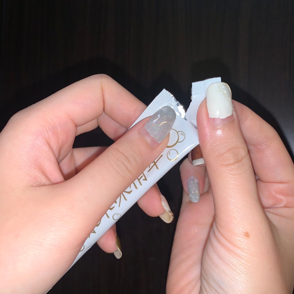 漾采凍精萃的包裝切口設計,輕鬆好撕開不沾手,不會像坊間條狀果凍或是醬料切口那樣,有夠難撕開就算了,好不容易撕開,內容物還會炸出來……因為可以直接撕開包裝切口,所以也不受地點限制囉!是隨處都可以拆開即食的美妍保健食品。
