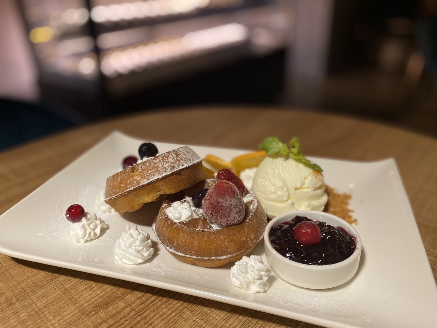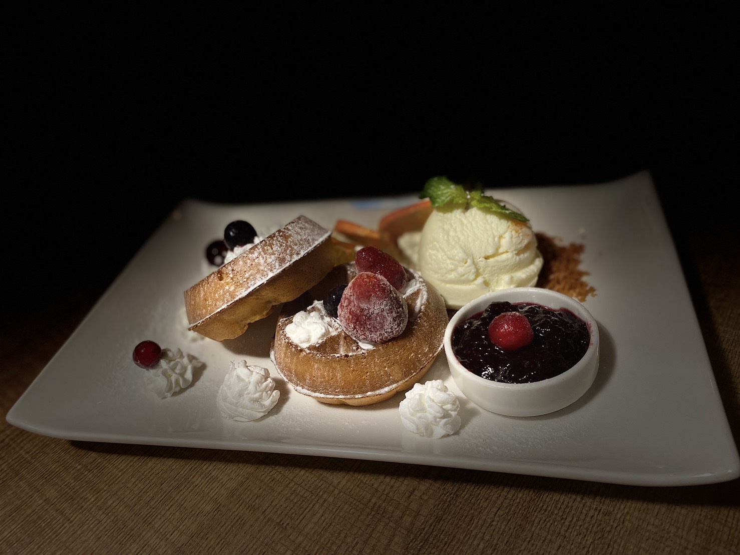 你猜旁邊的冰淇淋是香草嗎?錯!是優格口味唷~裡面還有水果碎塊,我猜應該是柳橙之類的,比起香草冰淇淋,優格口味的冰淇淋吃起來更輕盈。我一般不太喜歡是這種waffle鬆餅,很常踩雷吃到很乾很硬的,但這個鬆餅現烤,外面些微脆脆,裡面是鬆軟綿密的!過關~好吃~!
