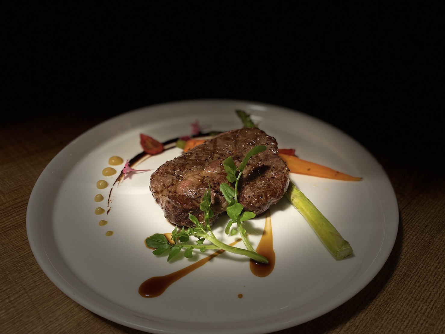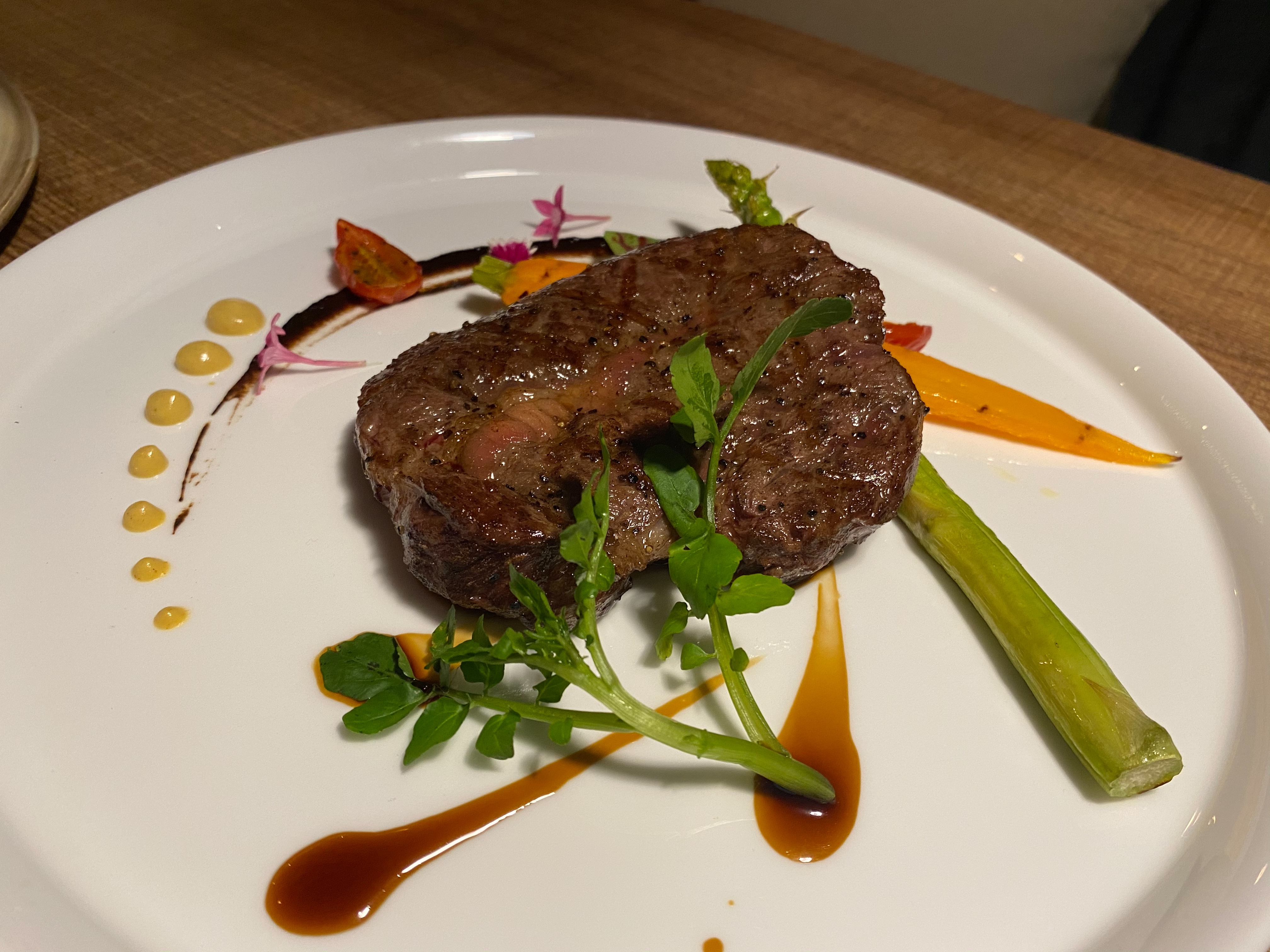 汗蒸加價套餐的主餐,我們選板腱牛,畫面蝦方的是牛肉汁,黃色是法式芥末醬,拿來畫盤的黑色醬汁是黑蒜醬,旁邊還有美國胡蘿蔔跟泰國蘆筍。等下~這擺盤也太美吧!忍不住一直拍耶~