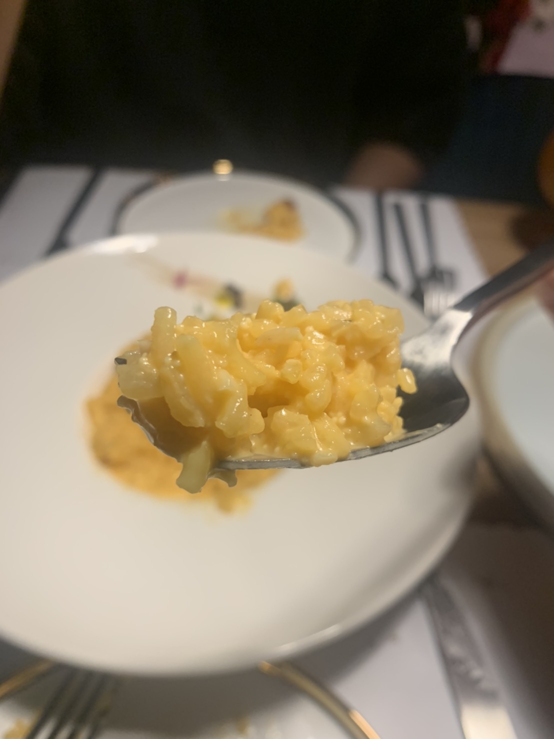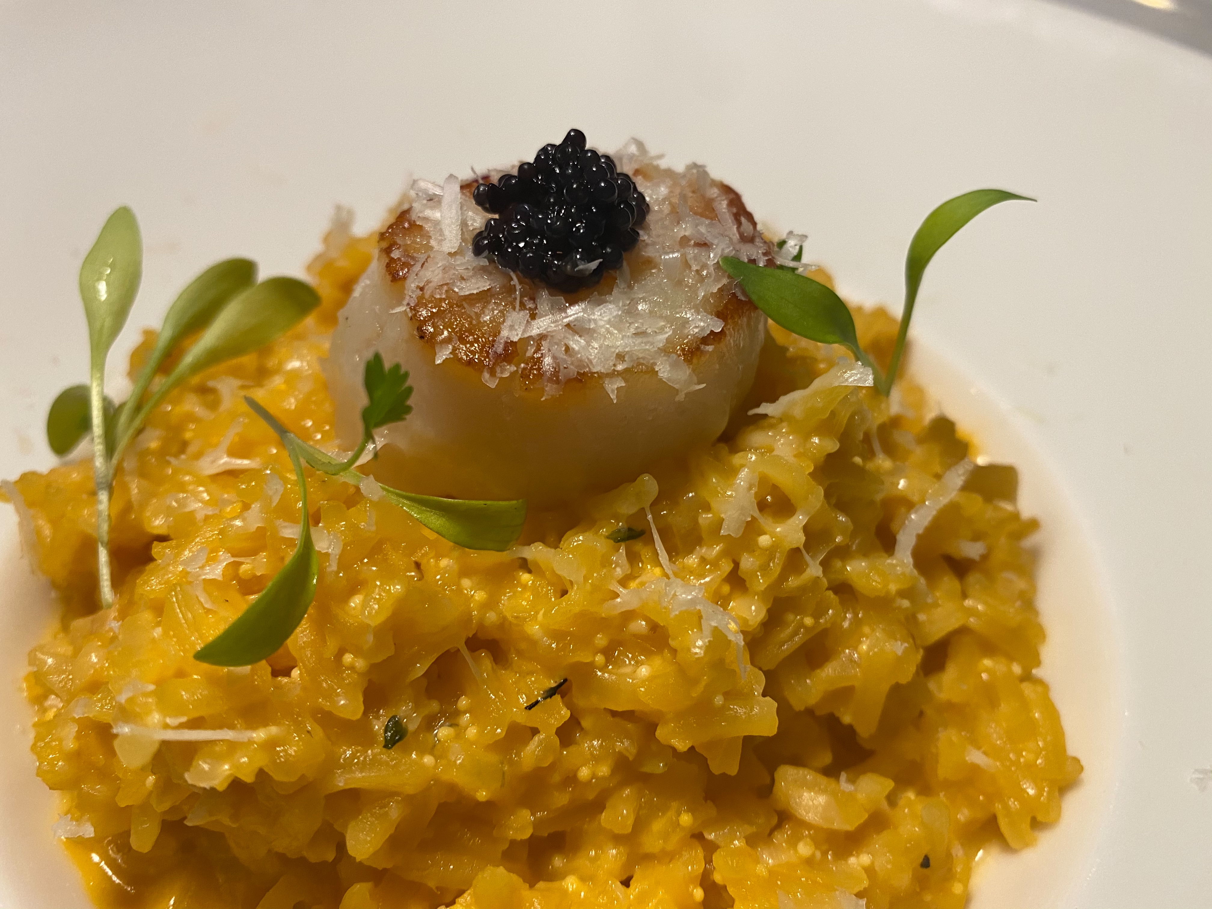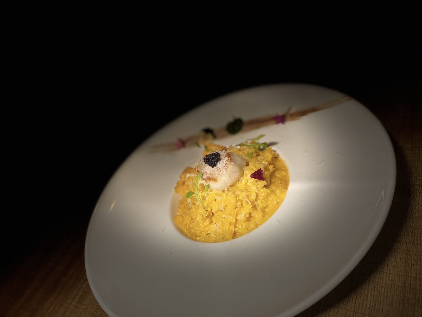 一大顆生食級干貝,干貝上還鋪了大概五塊錢大小的caviar,米是使用台灣米,米心不會想義式燉飯一樣偏硬,非常軟綿,吃進嘴巴裡,舌頭一壓就化開了~使用的是海膽魚卵醬,燉飯裡滿滿的都是魚卵!用量很足夠每口都會啵啵啵!海膽魚卵醬本身的海味,我覺得已經很足夠,但男友平常吃的口味比較鹹XD他說整體偏甜哈哈,但沾滿醬汁的燉飯配上干貝的清甜,我覺得味道好鮮~好好吃><