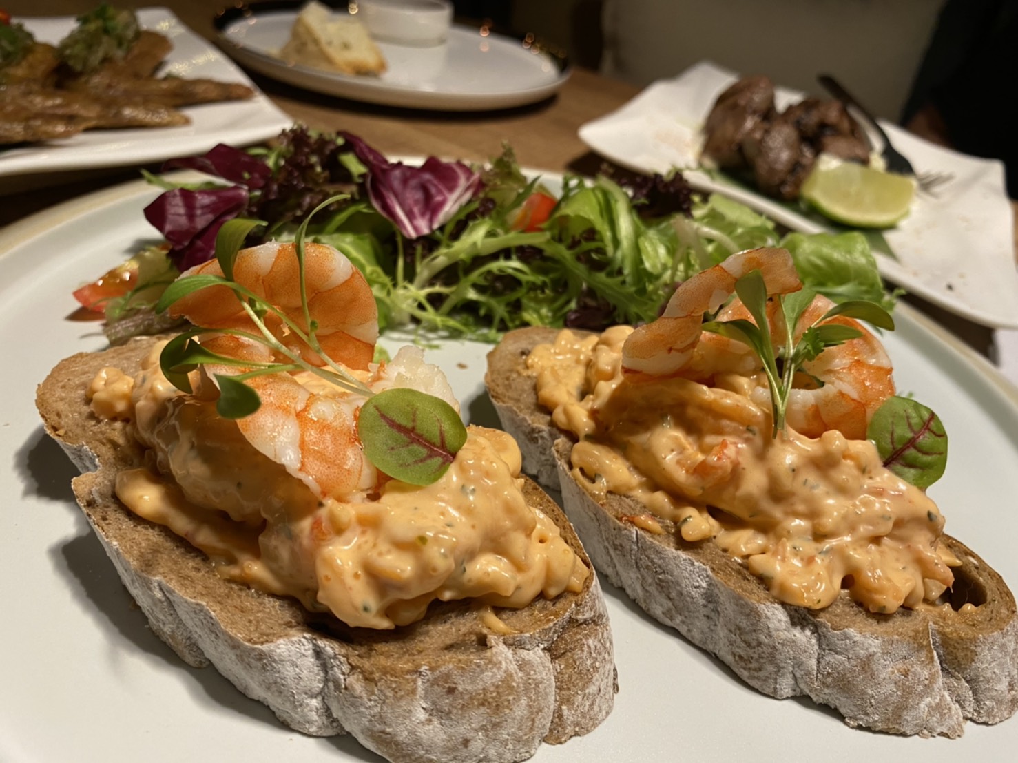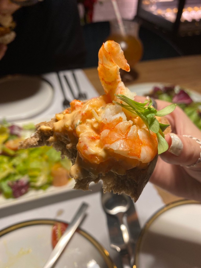 來了來了!我最喜歡的一道!龍蝦沙拉好好吃!龍蝦肉超多,最上面還放了完整的一隻蝦!不管是龍蝦沙拉的部分,或是三明治上方的蝦都超甜~齁好幸福!底下的麵包是偏全麥的那種麵包,味道很香裡面還有小小的核桃顆粒,龍蝦沙拉給超多,是咬一口要小心麵包上的料會掉下來的那種~滿足><