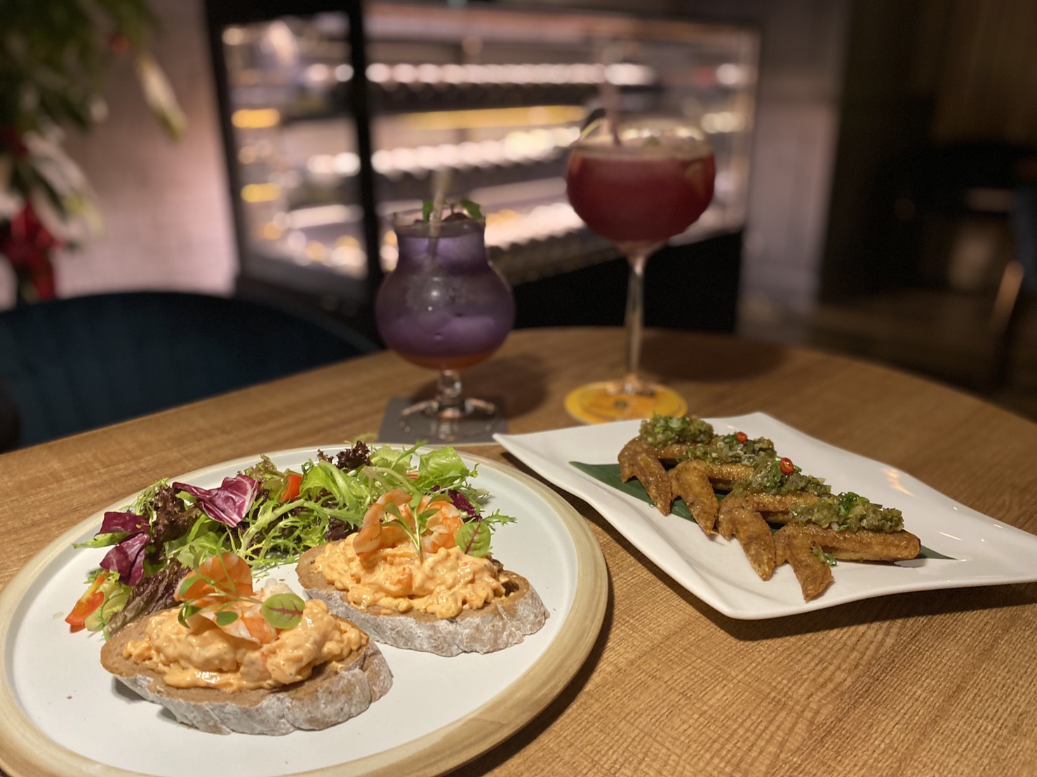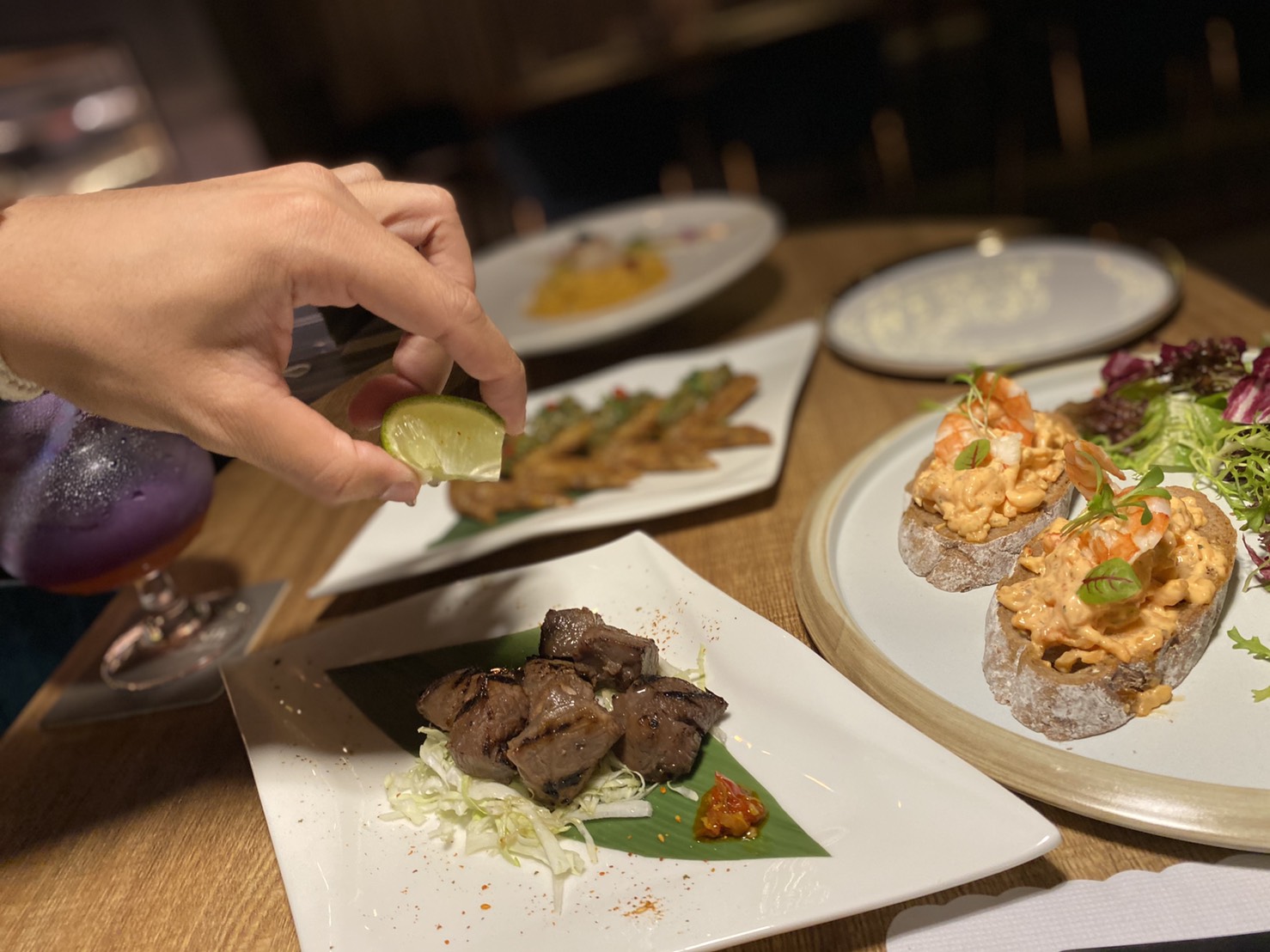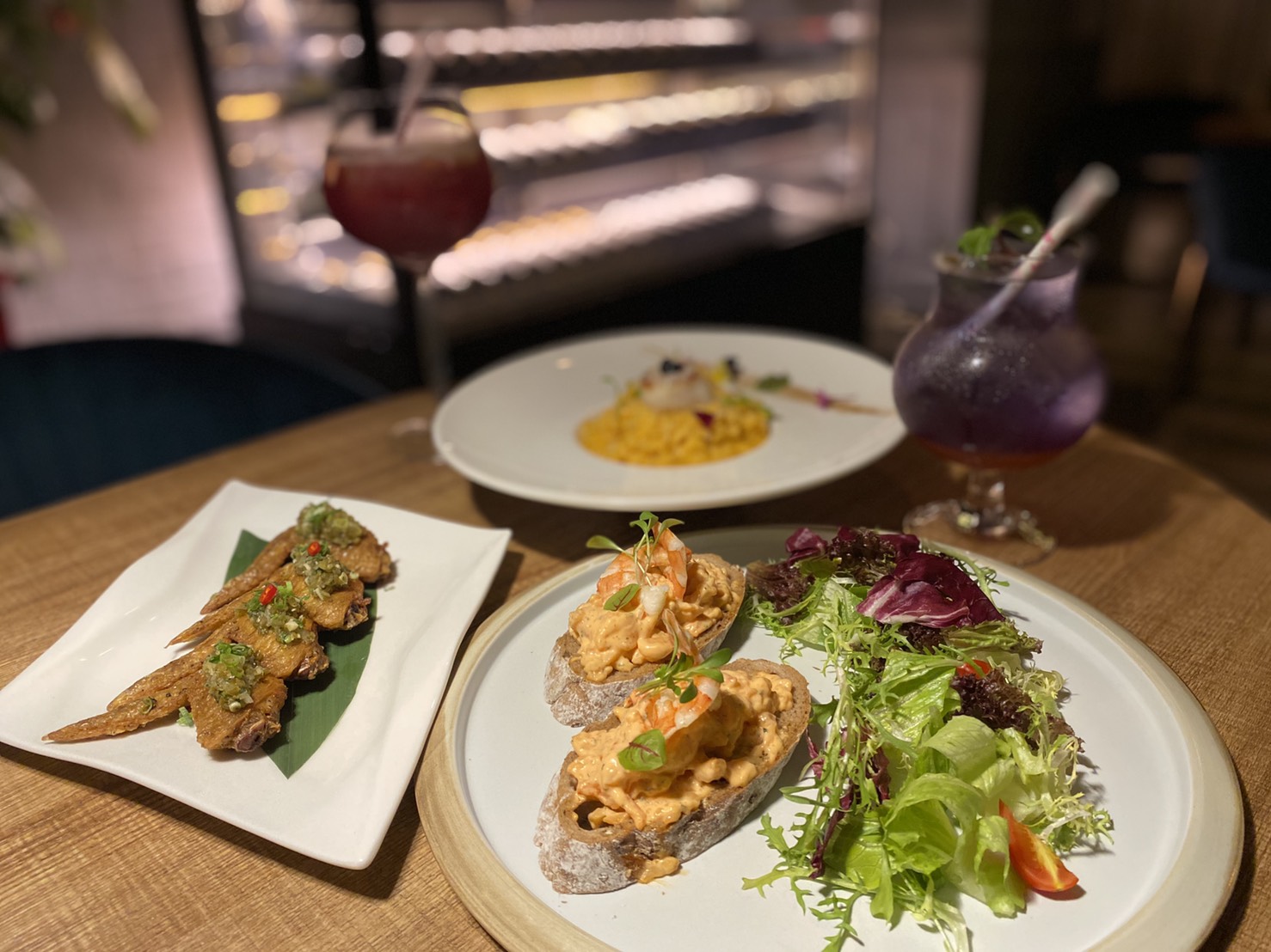 由於我們決定要搭配稍後的韓式汗蒸服務,一個人要加價$600元點汗蒸套餐,所以另外又點了單點的餐點一起Share。總共點了雞翅墨西哥辣椒、泰式骰子牛、海膽干貝燉飯、龍蝦開放沙拉;汗蒸的套餐內容有板腱牛排、百香果沙拉、松露野菇濃湯、佛卡夏麵包、甜點,訂汗蒸方案,加價$600元,可以吃到這麼豐富的菜色~太誇簪ㄌ~
