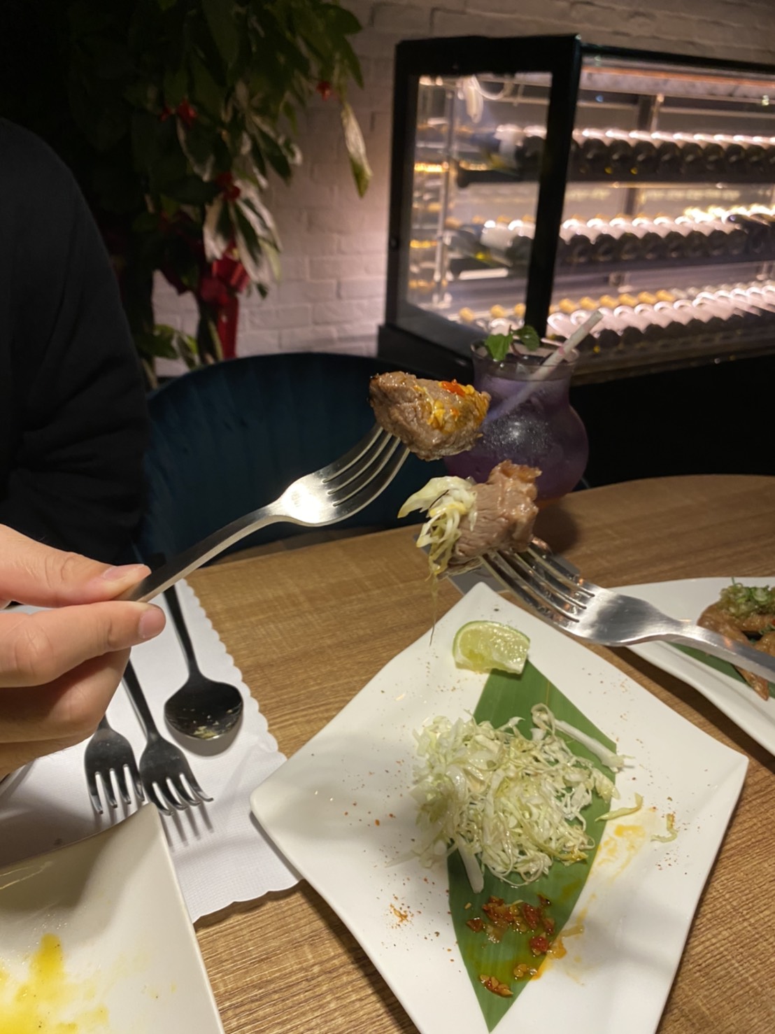 服務人員餐送上來時說,可以先單吃牛肉,再擠上旁邊的檸檬跟朝天椒,味道又完全不同。骰子牛有一點咬勁,但是不柴裡面很嫩,非常好咬,而且怎麼樣!肉超甜!!!!!嚇人的甜~沒吃過這麼甜的牛肉!再配上下面鋪的生高麗菜絲,擠上檸檬跟朝天椒,又是完全不同的味道,酸為中和了牛肉本身的甜,剝皮辣椒的辣度讓牛肉的層次提升,高麗菜絲的爽脆,搭配起來吃十分爽口~