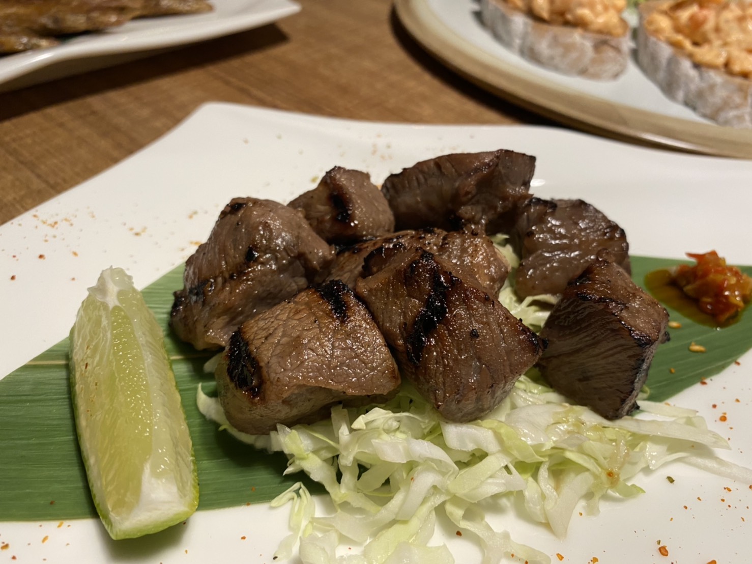 我跟男友都喜歡吃牛肉跟泰式,所以點了一道泰式骰子牛,這種烤得一點焦焦,還有烤網痕跡在上面的牛肉看起來最好吃了~(流口水),