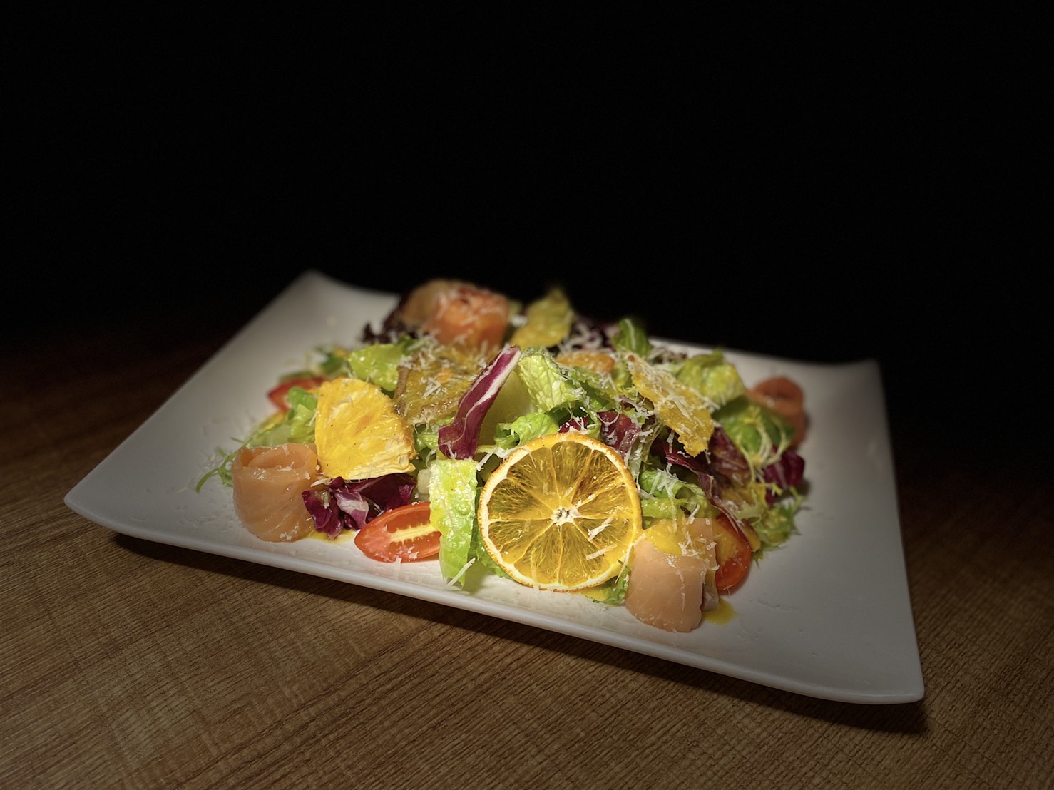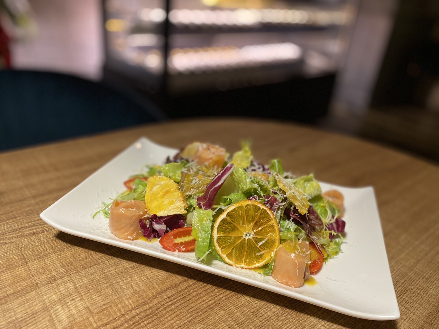生菜的部分非常脆,底下黃色的醬汁就是百香果汁唷!比起一般沙拉比較常搭配的沙拉醬,配上百香果的沙拉,口味非常清爽,做為開胃沙拉十分適合。煙燻鮭魚連不太敢吃生食的男友也大讚煙燻的很入味!