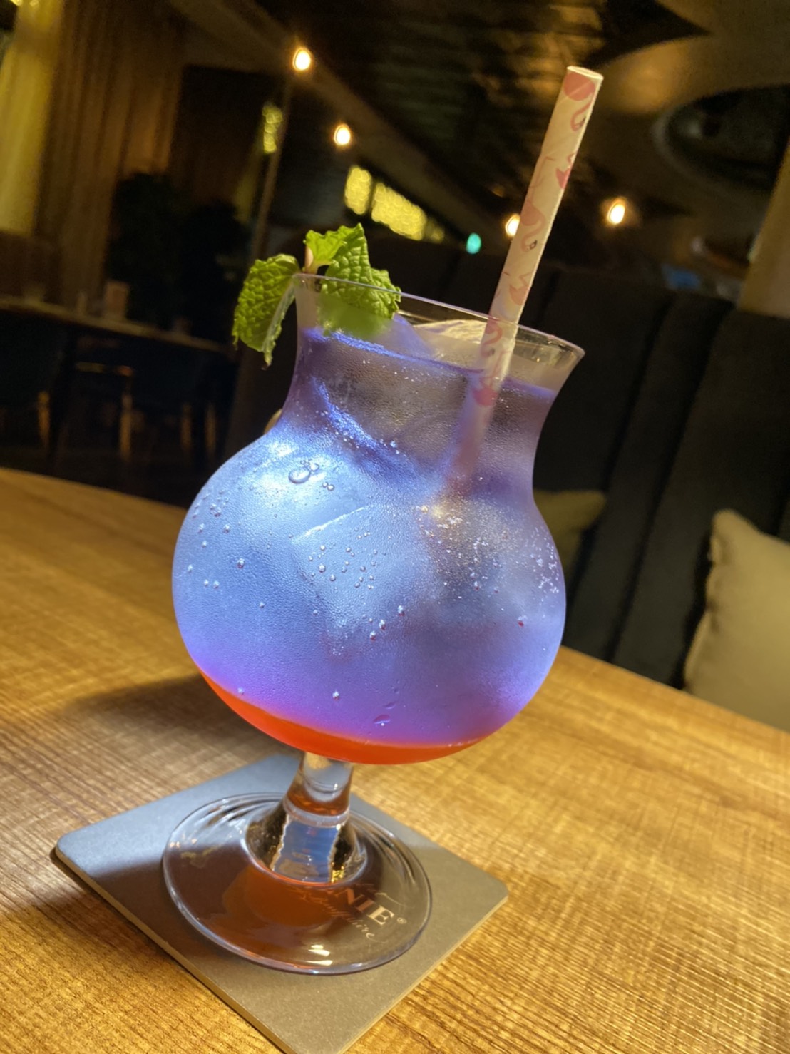 我跟男友分別點的是西班牙水果酒Sangria跟芒果蝶豆花氣泡飲,Sangria是我最喜歡的調酒,雖然是紅酒為基底,但是酒感不會太重,因為有加入很多的水果,所以喝起來酸酸甜甜,很適合配紅肉,而且超大杯XD不喝酒,或是有開車的人也可以參考無酒精的飲料唷~男友因為有騎車,所以點無酒精的芒果蝶豆花氣泡飲,顏色超漂亮,底層是黃色芒果醬,蝶豆花讓整杯看起來是神秘的藍色,我們還特別加燈光在飲料杯身後拍照XD充分攪拌之後讓氣泡飲跟芒果將充分融合,芒果醬很香不會過甜,配上蝶豆花特殊的香氣,讓人一口接著一口~