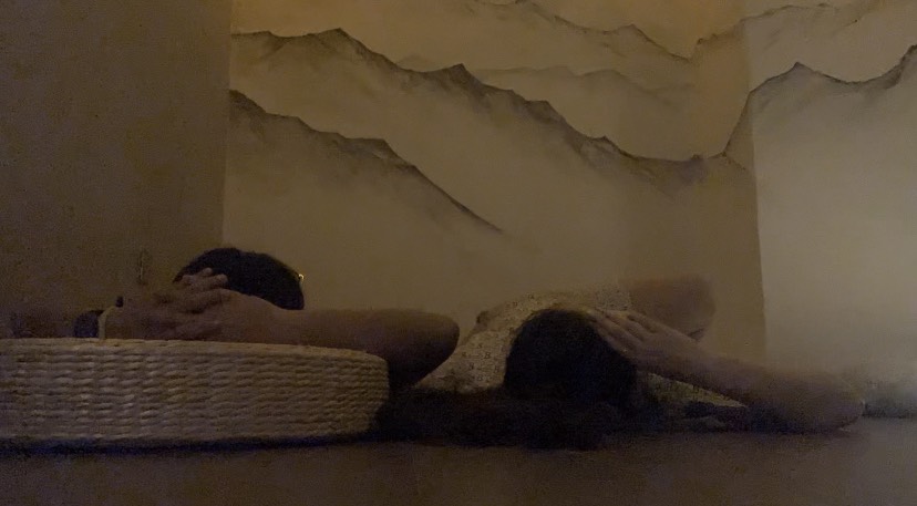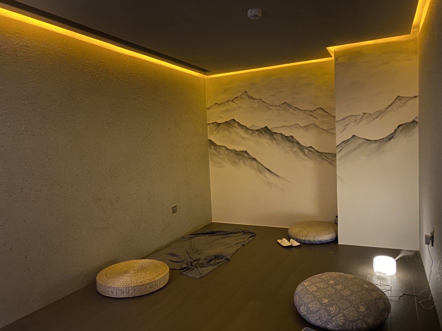 汗蒸房內的設計有墨畫,整體環境燈光偏暗、又是黃光,給人放鬆的感覺,牆邊也有加濕器,隨時確保汗蒸房內水氣足夠。
