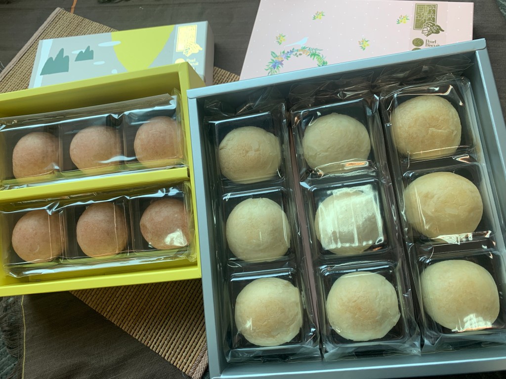 先來看看珍珠餅的外盒,左邊藍色包裝盒是六顆裝的蛋奶素珍珠餅;右邊的是粉色盒子裡則是九顆裝的葷食珍珠餅。