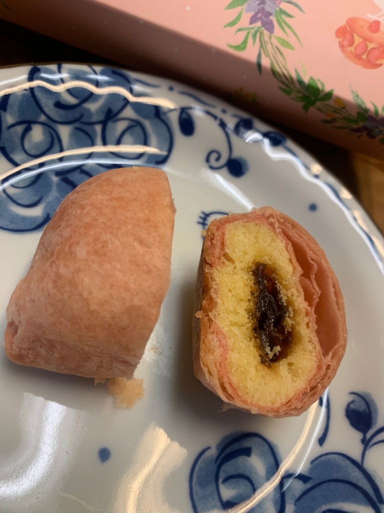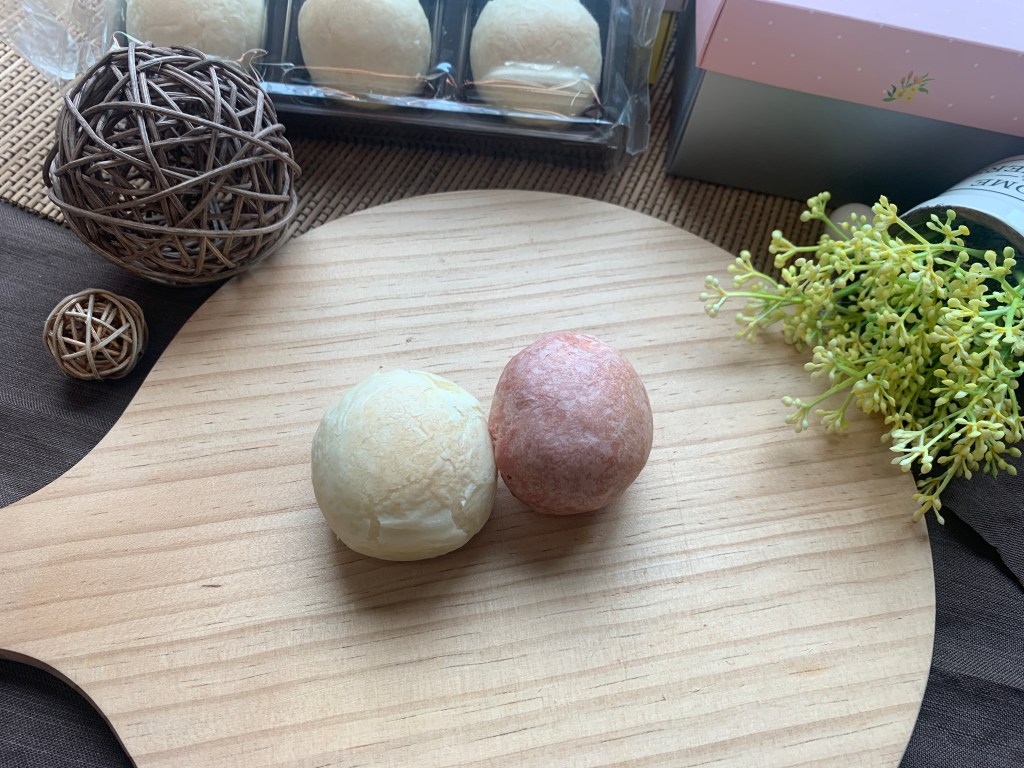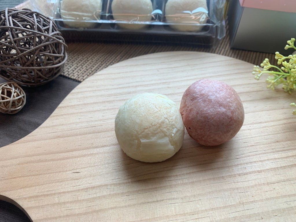 兩盒珍珠餅顆顆圓滾滾,看起來好好吃,蛋奶素餅皮是粉色的;而葷的珍珠餅餅皮為一般綠豆椪的米白色,我覺得這很貼心,中秋節收到月餅禮盒的時候,每顆都長一樣,都找不到要吃的口味XD 嬤嬤覓呀的珍珠餅禮盒用顏色就可以區分了,就不怕拿錯口味了