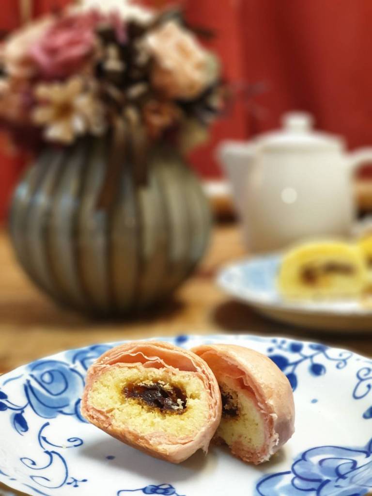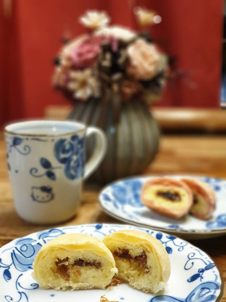 干貝絲因為烘焙的過程會稍微較乾,不過配上綿密濕軟的綠豆沙剛剛好!口味也因為干貝淡淡的鹹味,配上奶香的綠豆沙,恰到好處。我配著爸爸泡的紅棗人森蔘茶一起享用,紅棗人蔘茶甘苦甘苦的味道,更襯托珍珠餅的香甜,完美的下午茶!