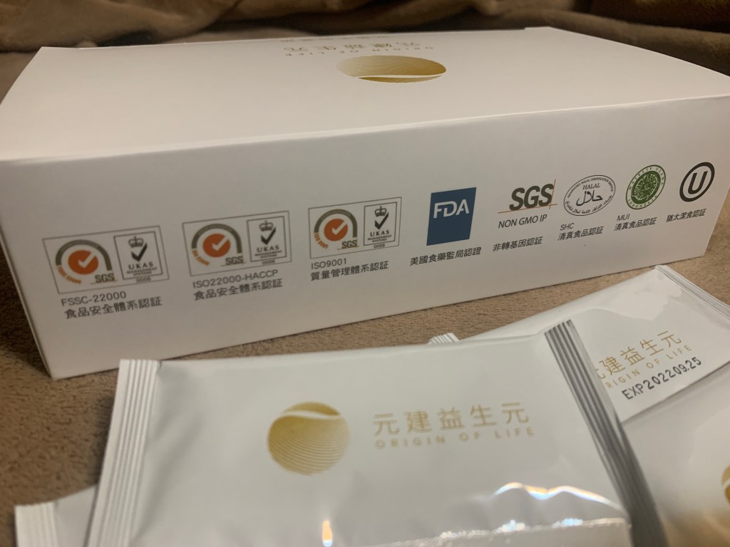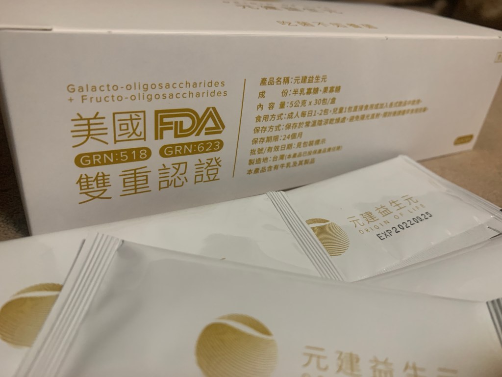 外盒還有標示【元建益生元】通過多項認證,從台灣的食品安全、美國食藥監局(相當於台灣的食藥署)到清真認證、猶太認證。順便科普一下清真認證,因為之前的工作有接觸過,基本上通過清真認證不只是回教徒可以吃而已,還表示食品在製作、包裝、運送等等過程,都符合安全、衛生,因為回教徒對於食物的整潔,來源有一定的要求,所以通過此認證的產品則表示他在送到你手上前的所有步驟都是非常謹慎,值得信賴的!