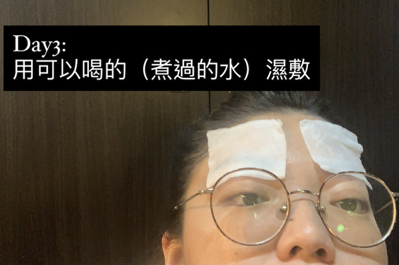 分享一下濕敷的樣子,哈哈我自己覺得挺好笑的,但濕敷真的要認真敷唷!記得要用生理食鹽水或是煮過的可以喝的水,避免使用化妝水、生水等等。