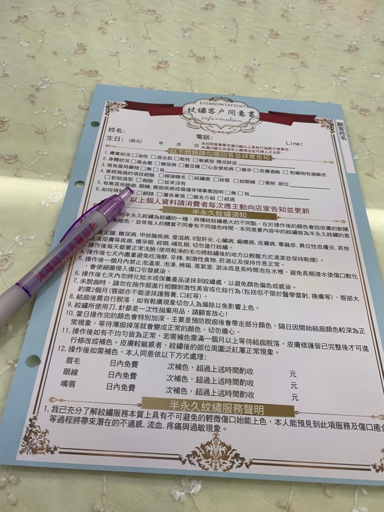 表單內容基本上就是了解是否適合施作,如果有高血壓、蟹足腫、心血管疾病等等,不太建議做紋綉項目,再來就是確認施作項目,以及注意事項
