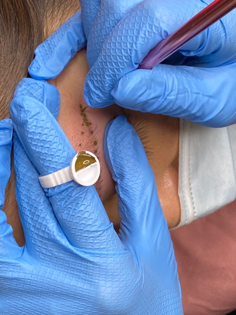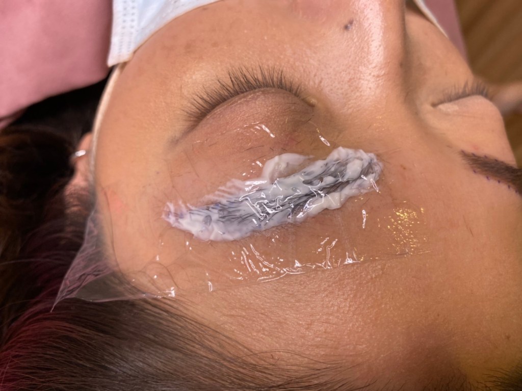 定位完就會上舒緩膏,基本上會讓眉毛區塊可以比較適應稍後的施作,塗上舒緩膏會蓋上保鮮膜靜待30分鐘~