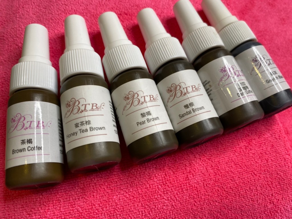 敷上舒緩高後開始挑選眉色,由淺到深有:茶褐、蜜茶棕、黎褐、檀棕、深咖啡、墨灰,一般來說霧眉老師會建議挑選跟髮色接近的顏色