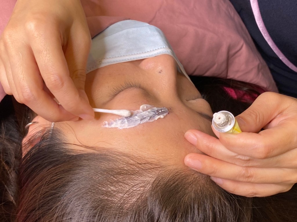 - 做完眉3小時內,以生理食鹽水濕敷5分鍾後,輕輕擦拭,持續約5-6次(大概半小時一次),最主要是去除滲出組織液,避免讓空氣中的髒污附著於眉上。