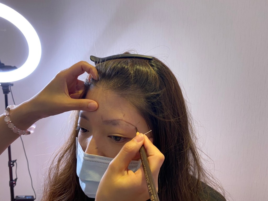 會用藍色油性筆點出眉行的位置,因為稍後會敷上舒緩膏,原先眉筆畫的形狀可能會糊掉,定位才可以確保後續上色的準確性~如果有雜毛的話老師也會幫忙清掉唷!
