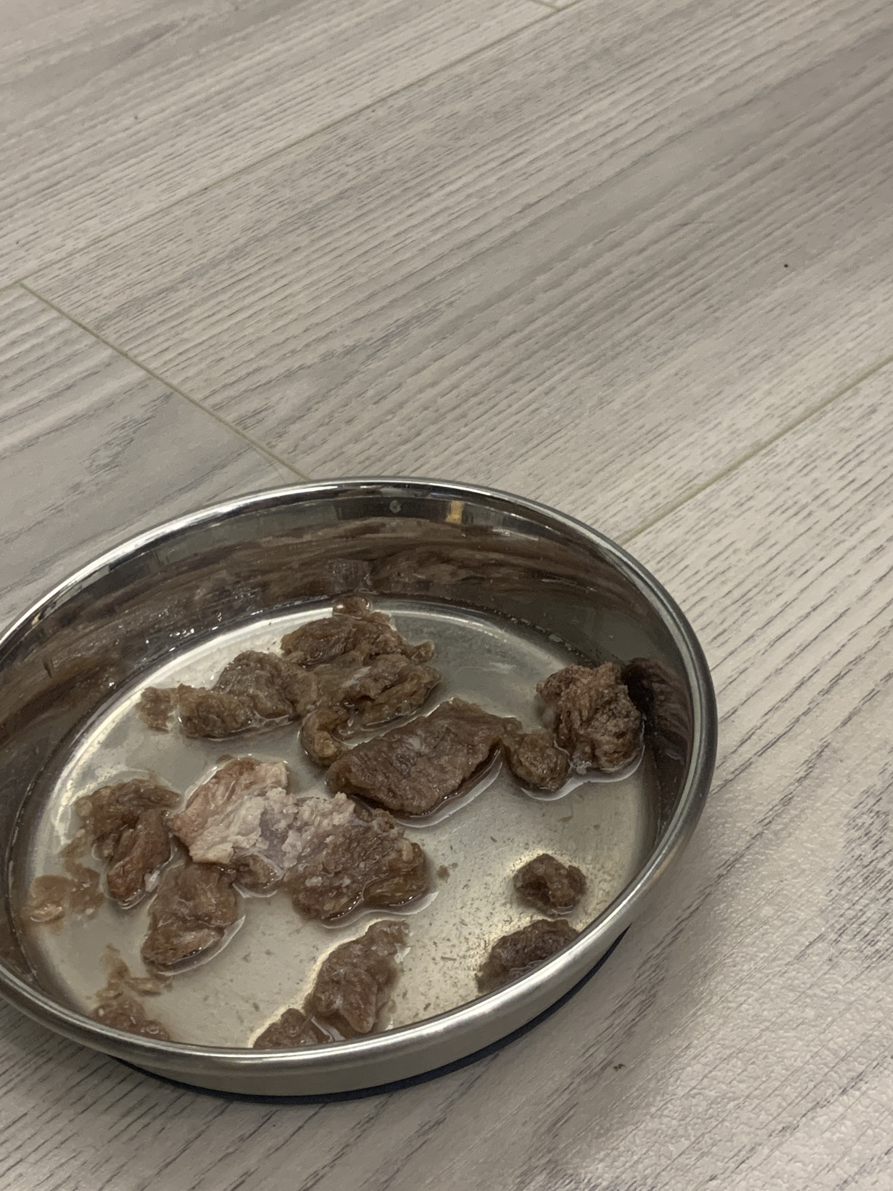奶球比較喜歡雞肉塊,牛肉塊一直舔但只吃一小小口哈哈!