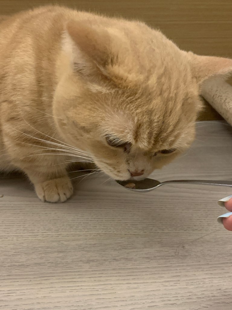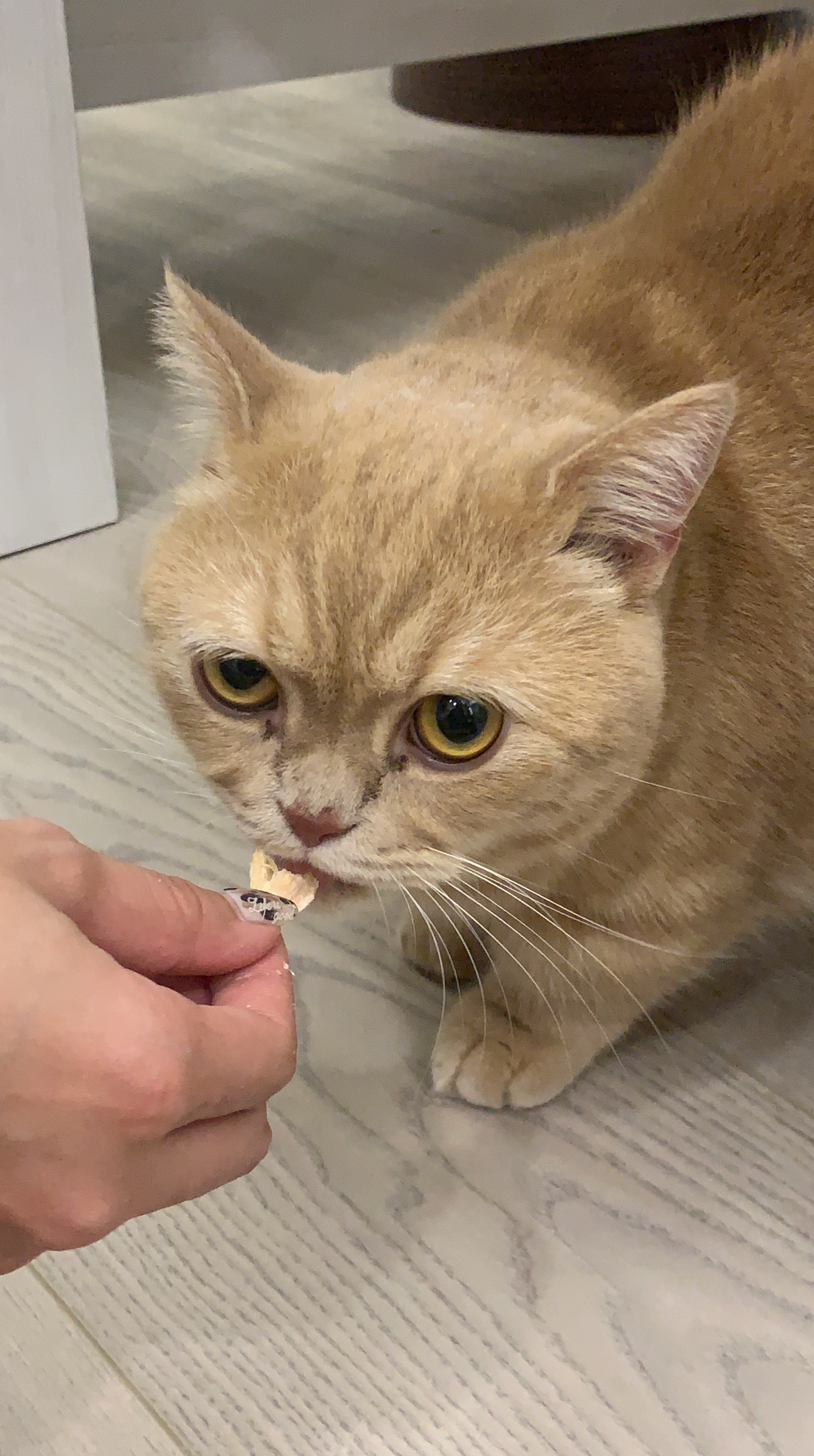 因為奶球吃東西都小小口,所以我們把雞肉塊撕小小餵他,也因為吃過飯了,再加上奶球又是小挑食怪,我們把凍乾當零食讓他試試看,奶球很有興趣,一直跑過來聞,舔一舔就吃進去了