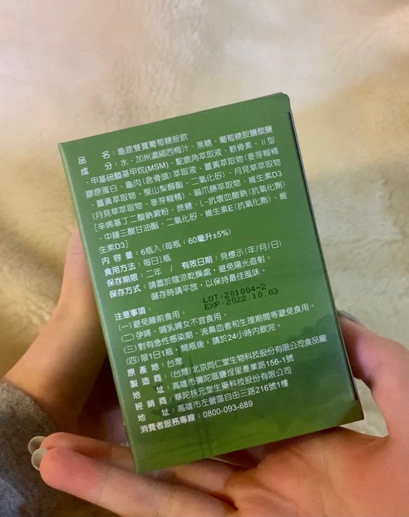 陳美鳳代言推薦的這款龜鹿雙寶葡萄糖胺飲,一盒六罐裝。外盒上成分、熱量跟賞味期限都標示得相當清楚~配分有龜鹿雙寶、葡萄糖胺,以及第二型膠原蛋白,都是幫助身體靈活的黃金組合,全方位滋補,其他也有軟骨素、維生素D、薑黃、貓爪藤等八合一配方,全效修護,維持身體敏捷度跟活力的成分。