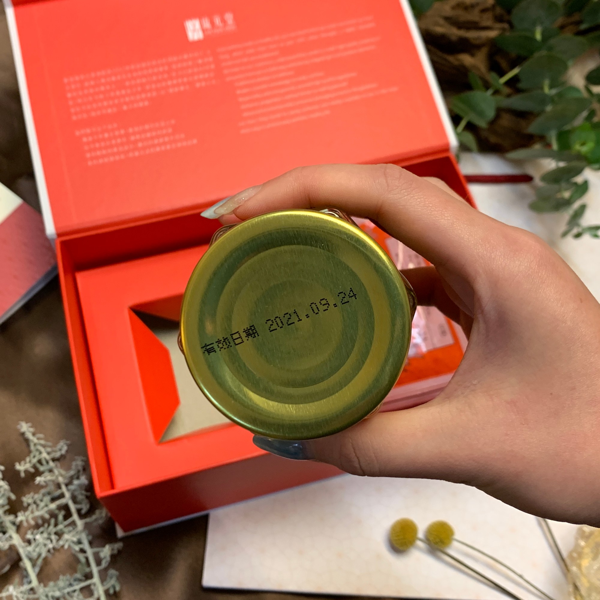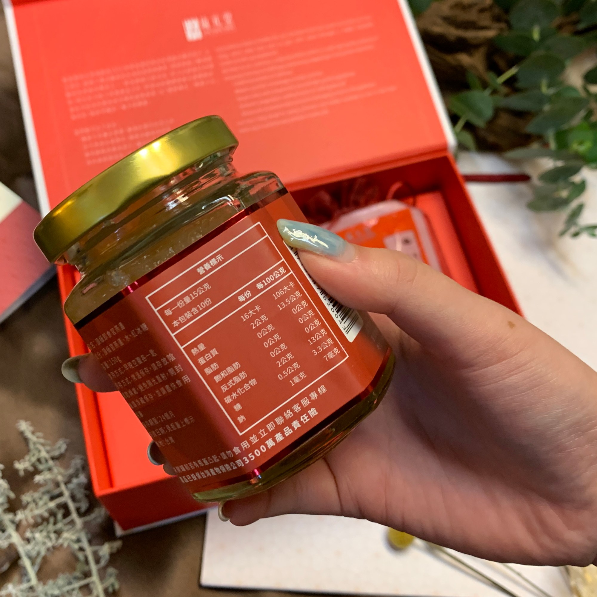頂級即食官燕盞燕窩的瓶身是摸起來微霧面、滑滑質地的貼紙,瓶身的注意事項、熱量、成分及瓶蓋上的保存期限都標示得相當清楚,成分相當單純,只有紅冰糖、水跟頂級金絲官燕盞。一瓶150g的熱量不到兩百大卡,以一天吃一至兩勺的量來說大概也十大卡左右而已,可說是營養保健之餘,也無負擔呢!