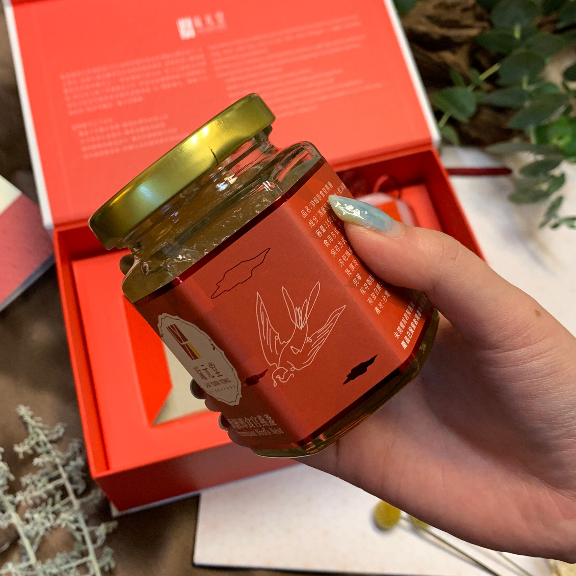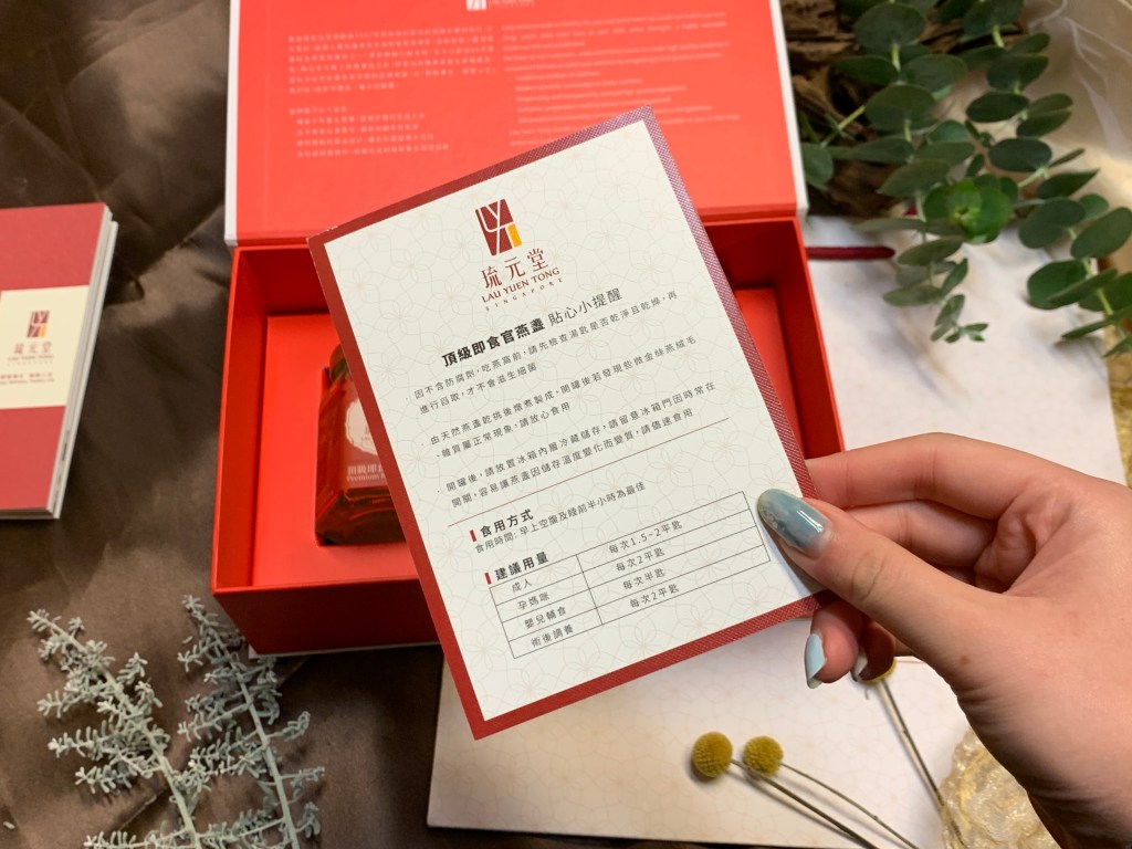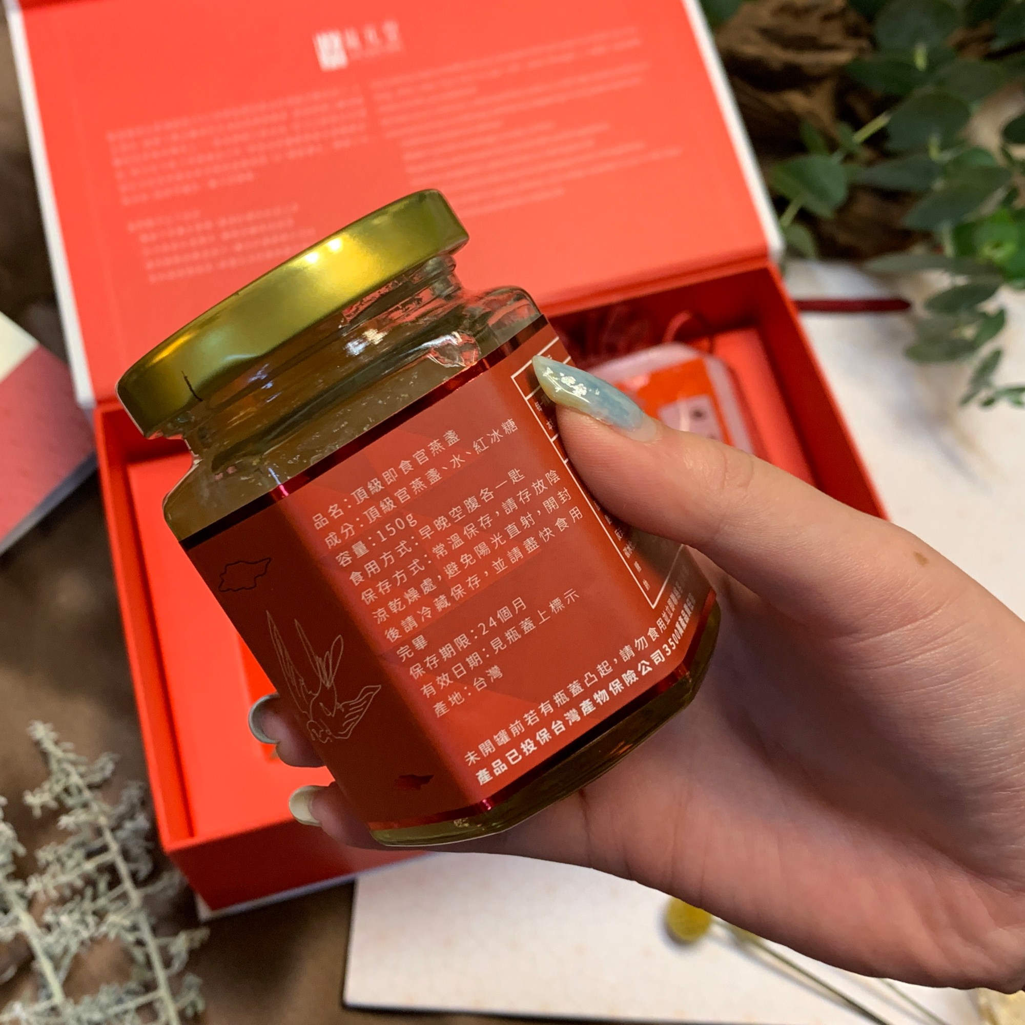 從即食燕窩飲到醇雞精華,跟這次的頂級即食官燕盞經典禮盒,最大的共通點就是,包裝實在很吸睛,主視覺非常具古風及美感,禮盒外觀是白色上頭有紅金色燙印的品名、品牌名跟燕子圖示,是向上掀開的設計