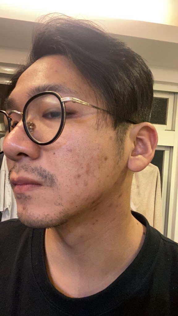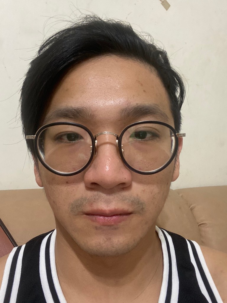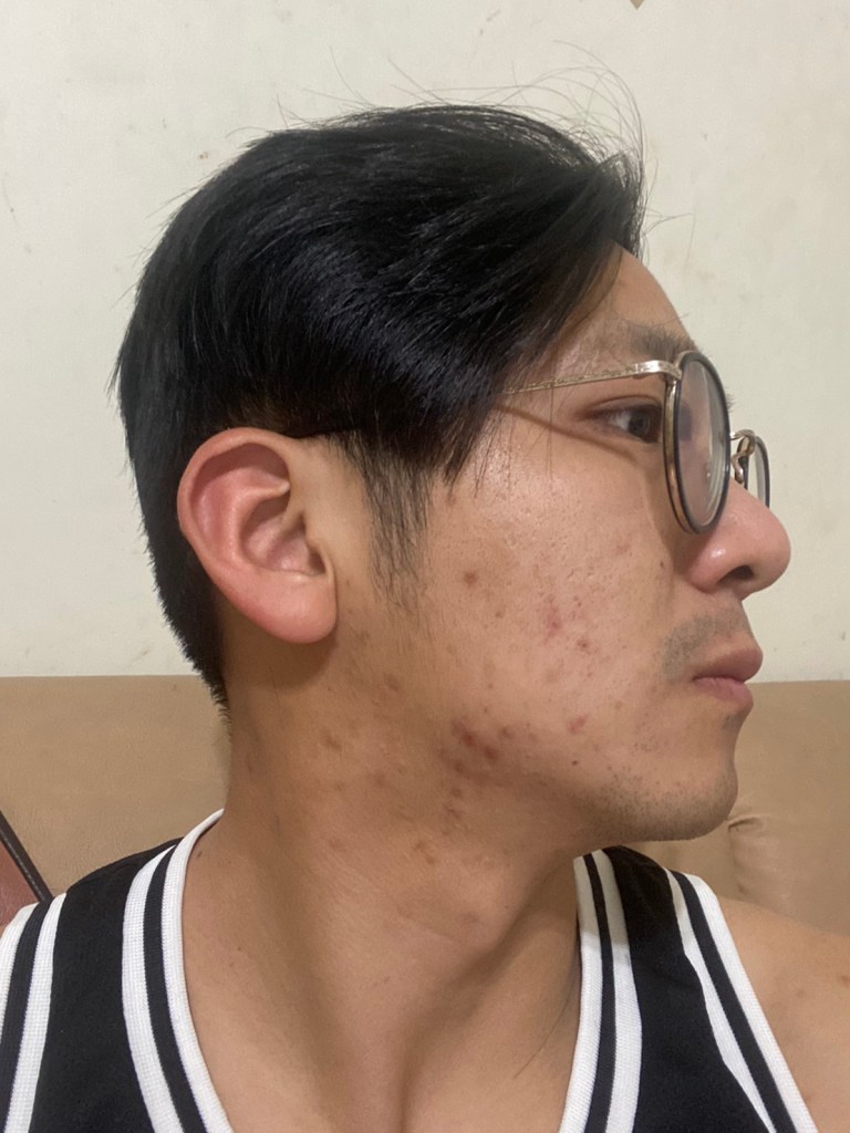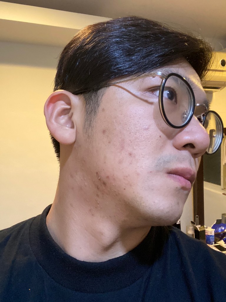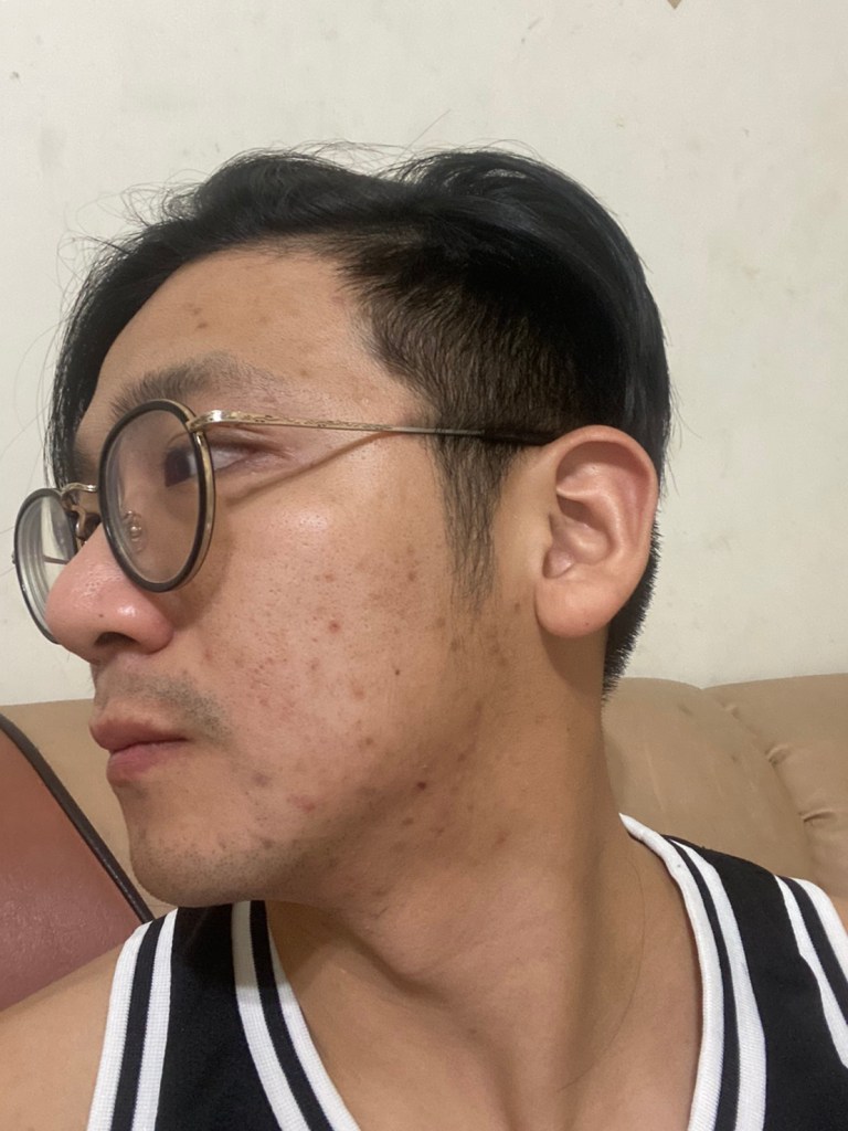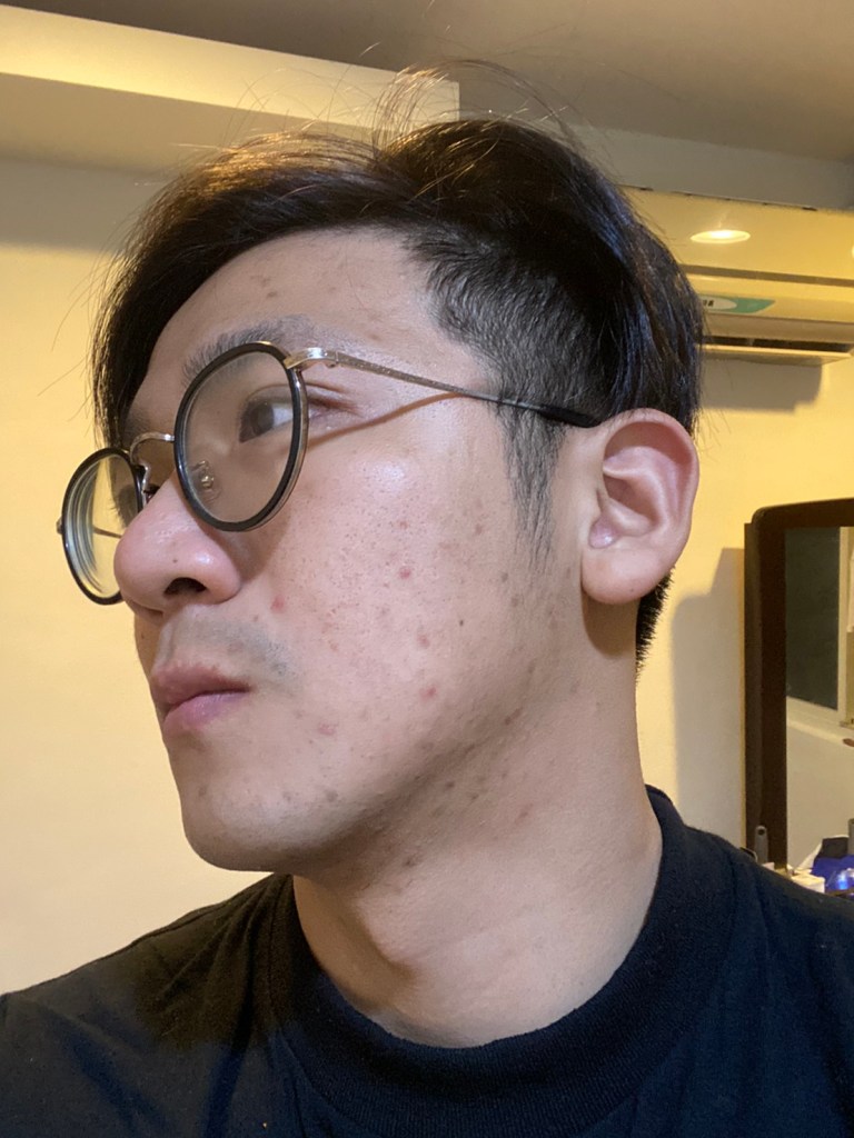 男友因為內分泌問題,痘痘肌困擾已久,平常也很愛亂擠痘痘跟粉刺,對於日常保養僅限清潔洗臉,化妝水、乳霜而已,臉上有紅腫顆粒跟毛孔,摸起來不平滑,所以可以讓他的肌膚穩定一點是我們期待看到的狀況。