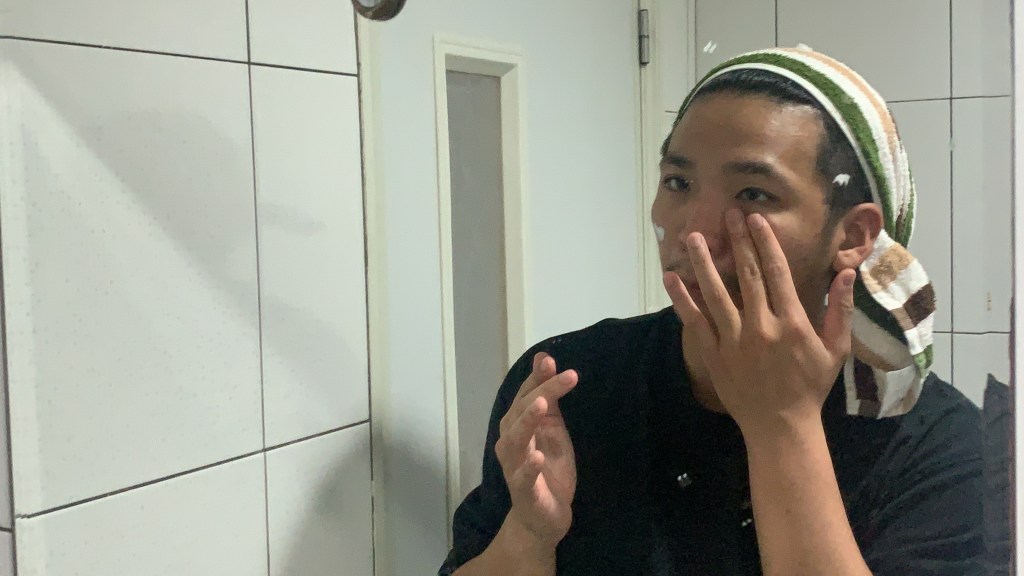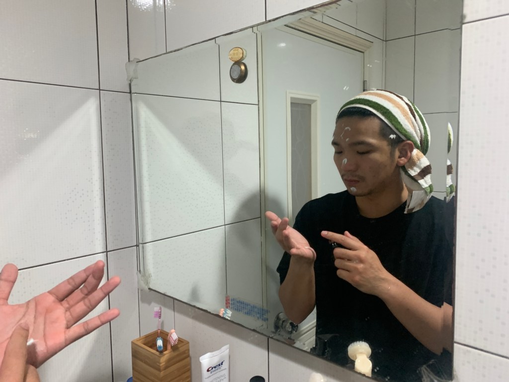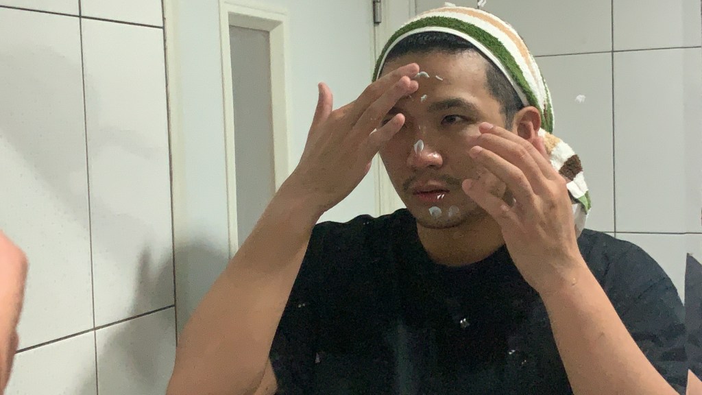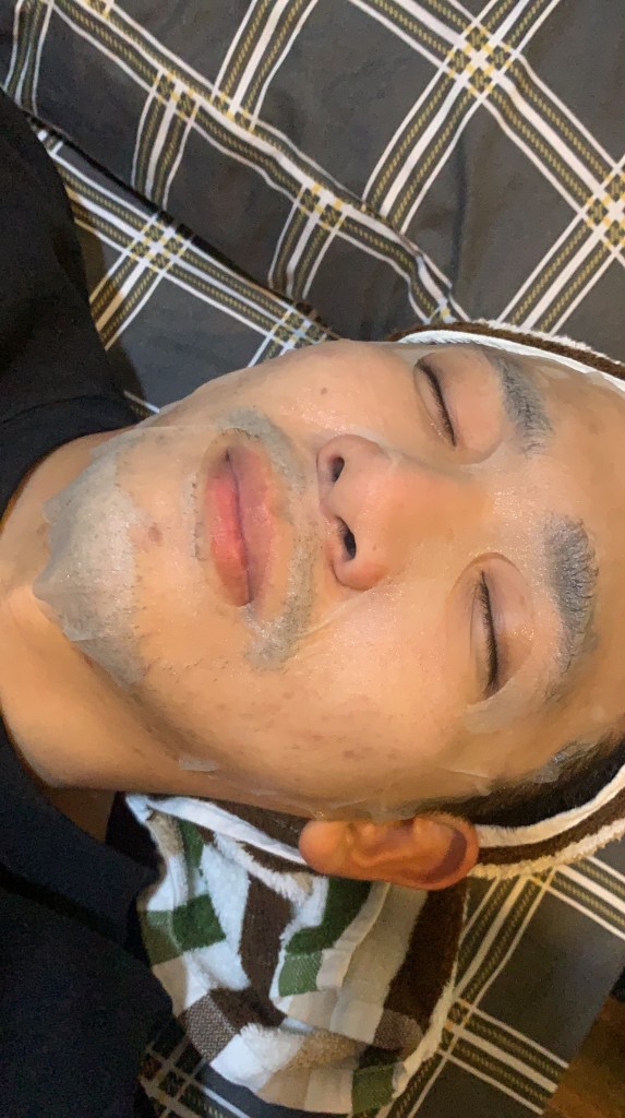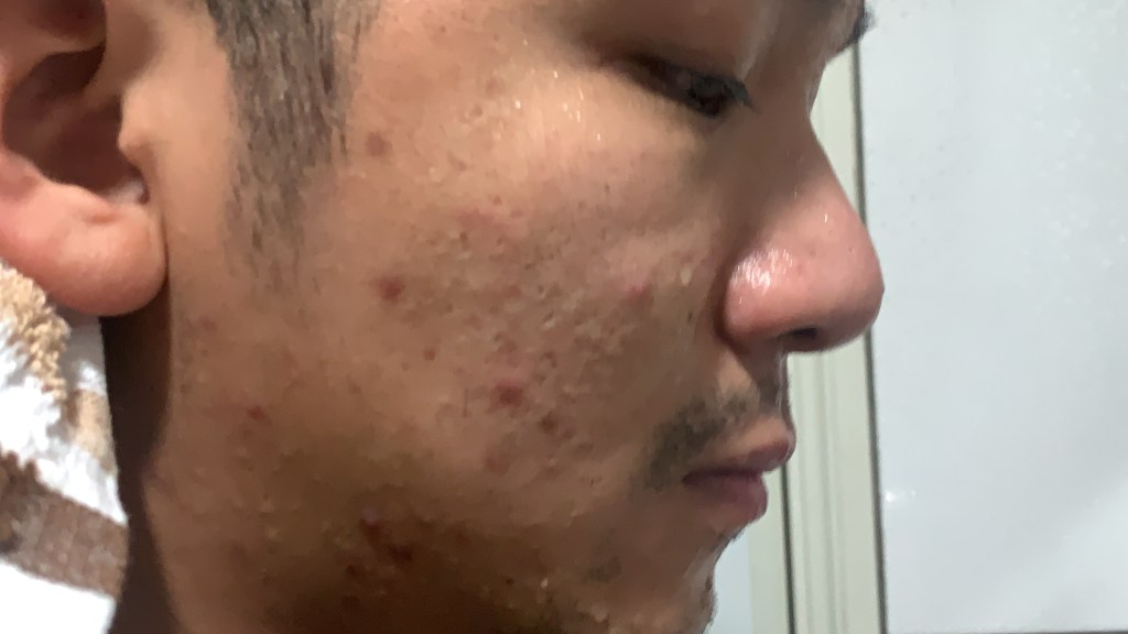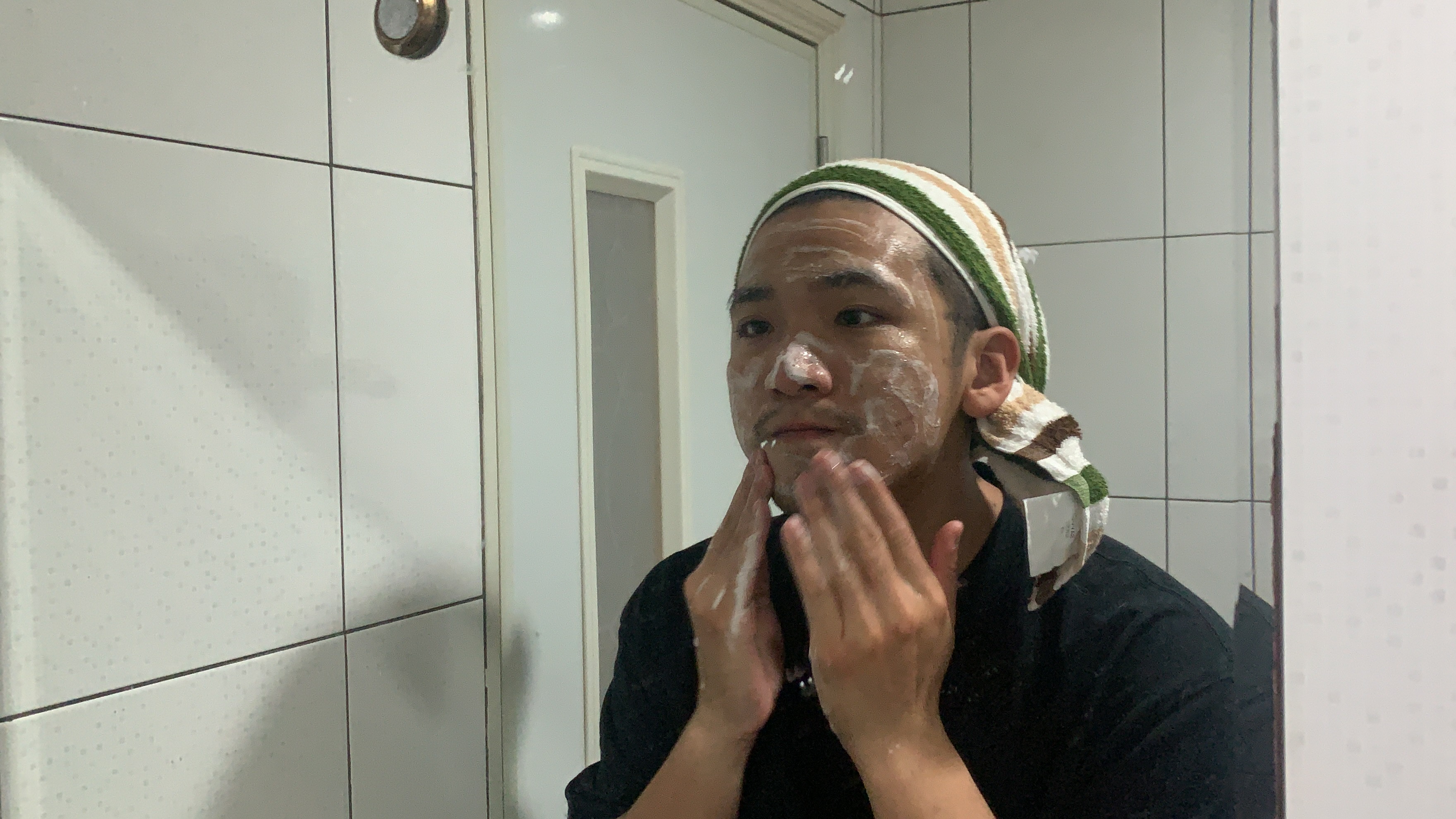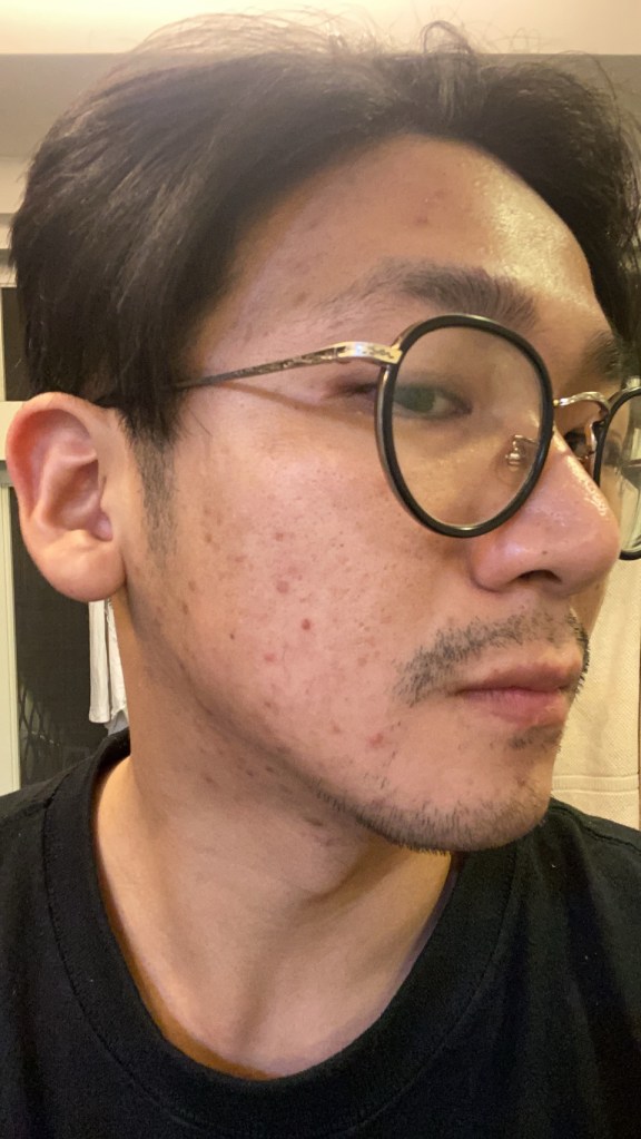 男友因為內分泌問題,痘痘肌困擾已久,平常也很愛亂擠痘痘跟粉刺,對於日常保養僅限清潔洗臉,化妝水、乳霜而已,臉上有紅腫顆粒跟毛孔,摸起來不平滑,所以可以讓他的肌膚穩定一點是我們期待看到的狀況。