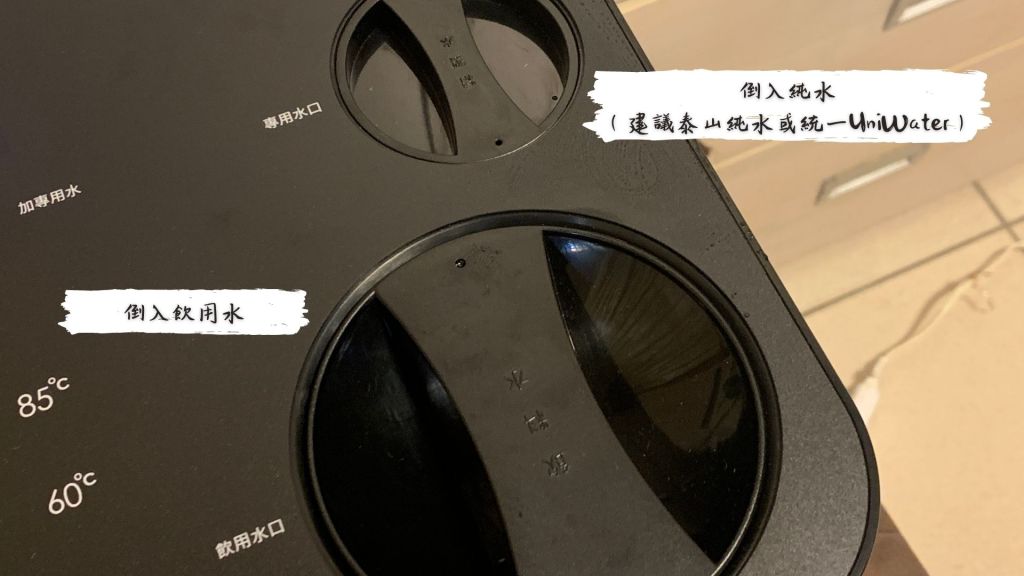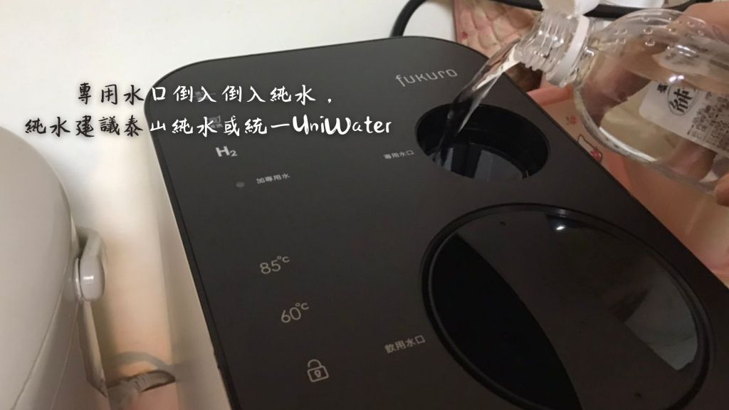 一開始使用要先活化濾芯,將純水加入專用水口,水量不超過滿水線,大概可以淹過裡頭網子的高度就行了,純水建議可以去便利商店買泰山純水或是統一UniWater,需要的量其實不大,買一瓶回家就可以了