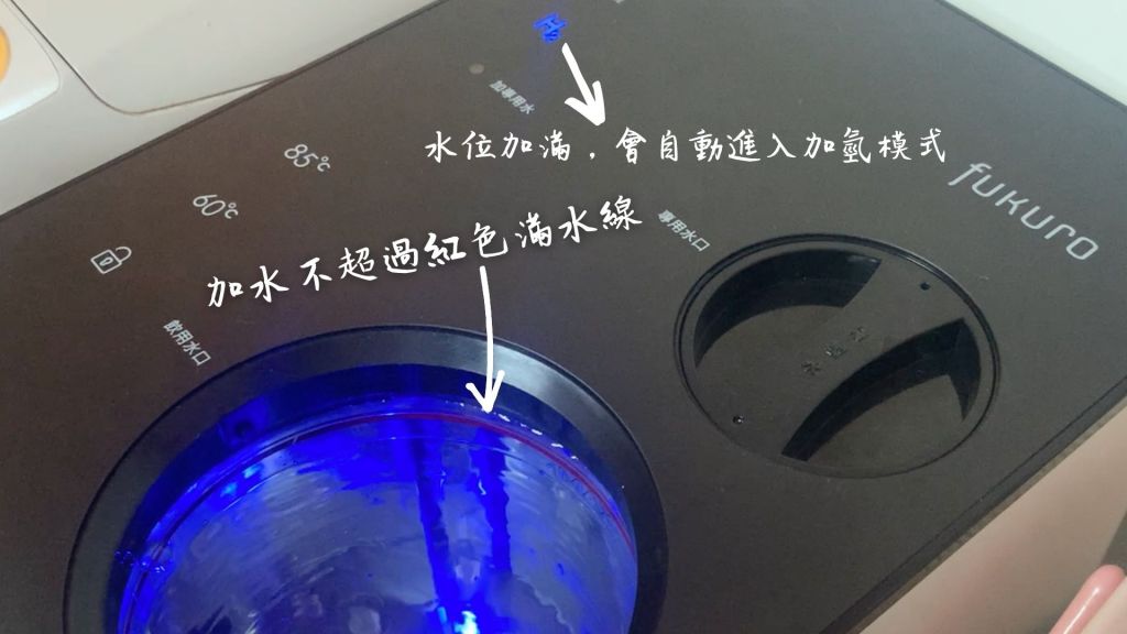 在飲用水口中加入平常家裡喝的水,紅線是滿水線,水位到達後,機器會自動開始加氫,飲用水口中會亮藍色燈,H2加氫鍵會亮起,加氫會持續15分鐘,會冒泡泡跟滿大的聲音,第一次聽到我還以為把它弄壞了XD