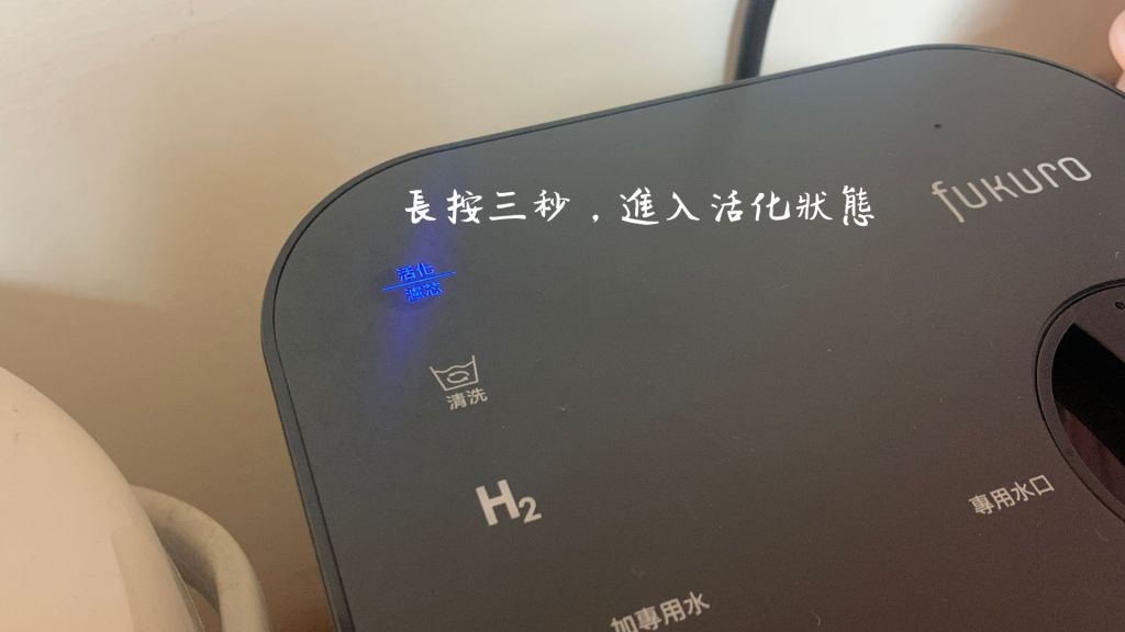 加入純水到專用水孔後,插上電線、開啟電源後活化鍵會亮燈,要在開機後一分鐘內,長按三秒活化濾芯鍵,會發出嗶嗶聲,就開始活化狀態