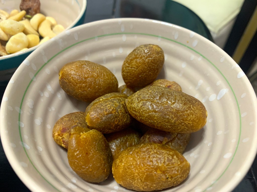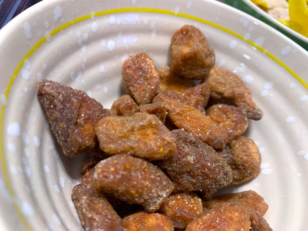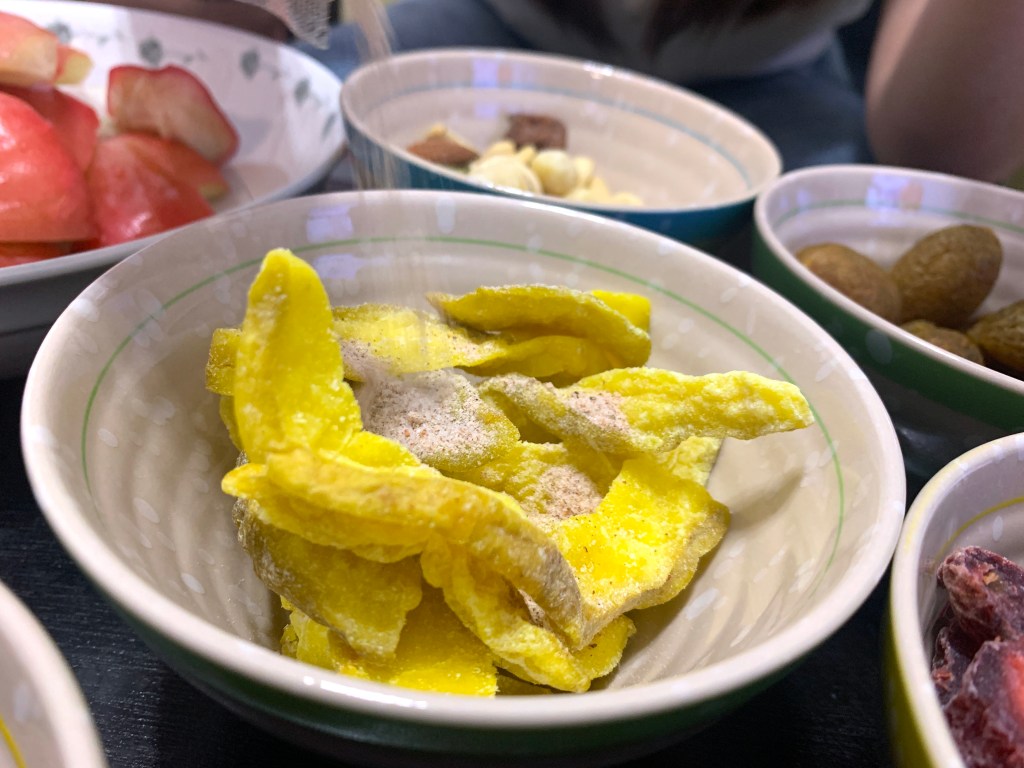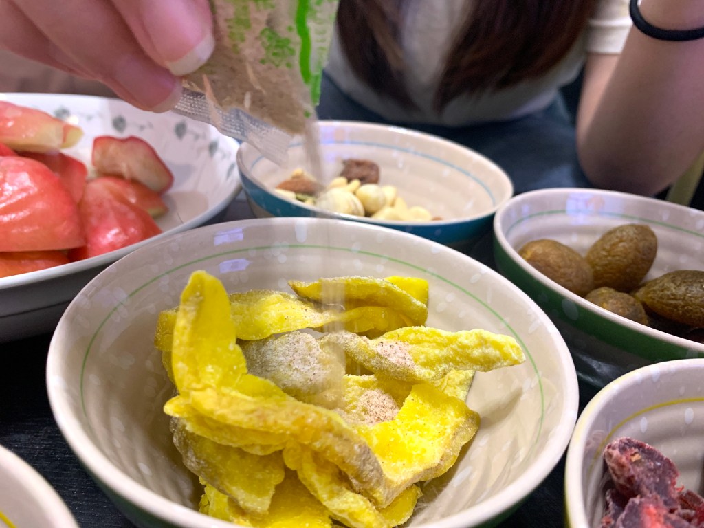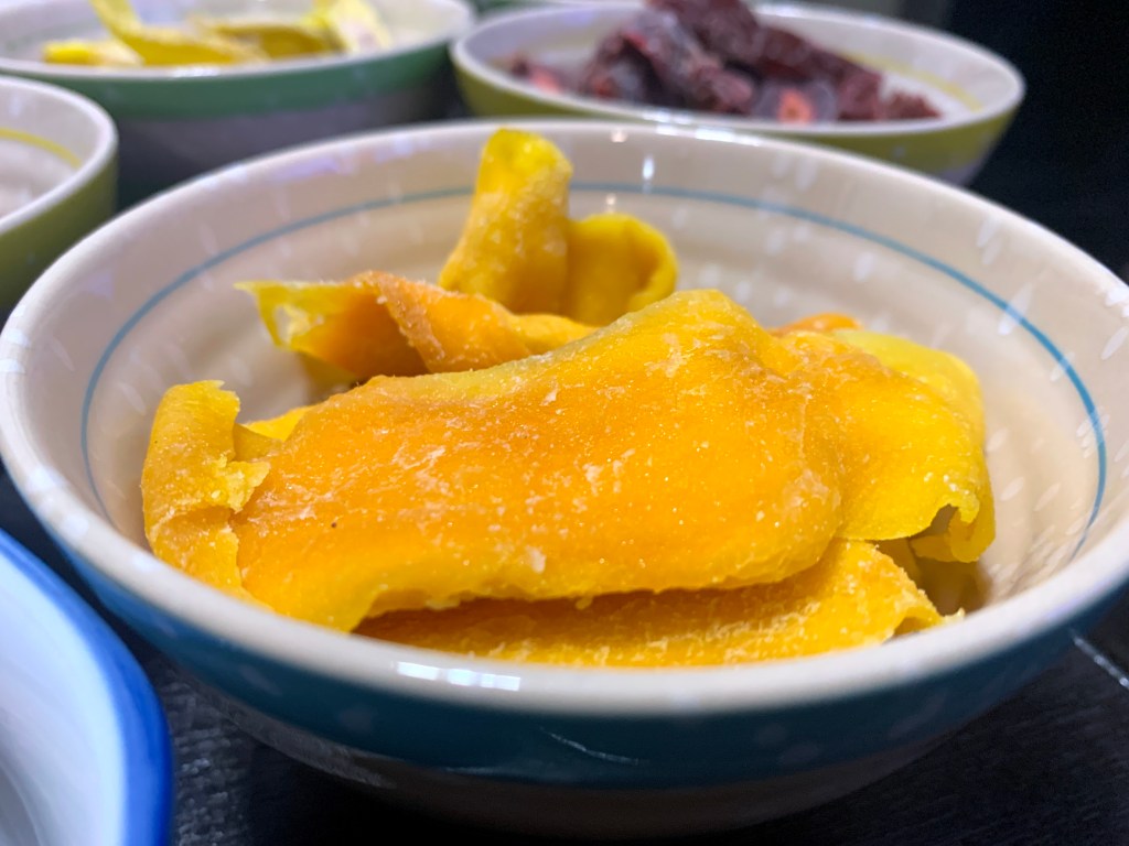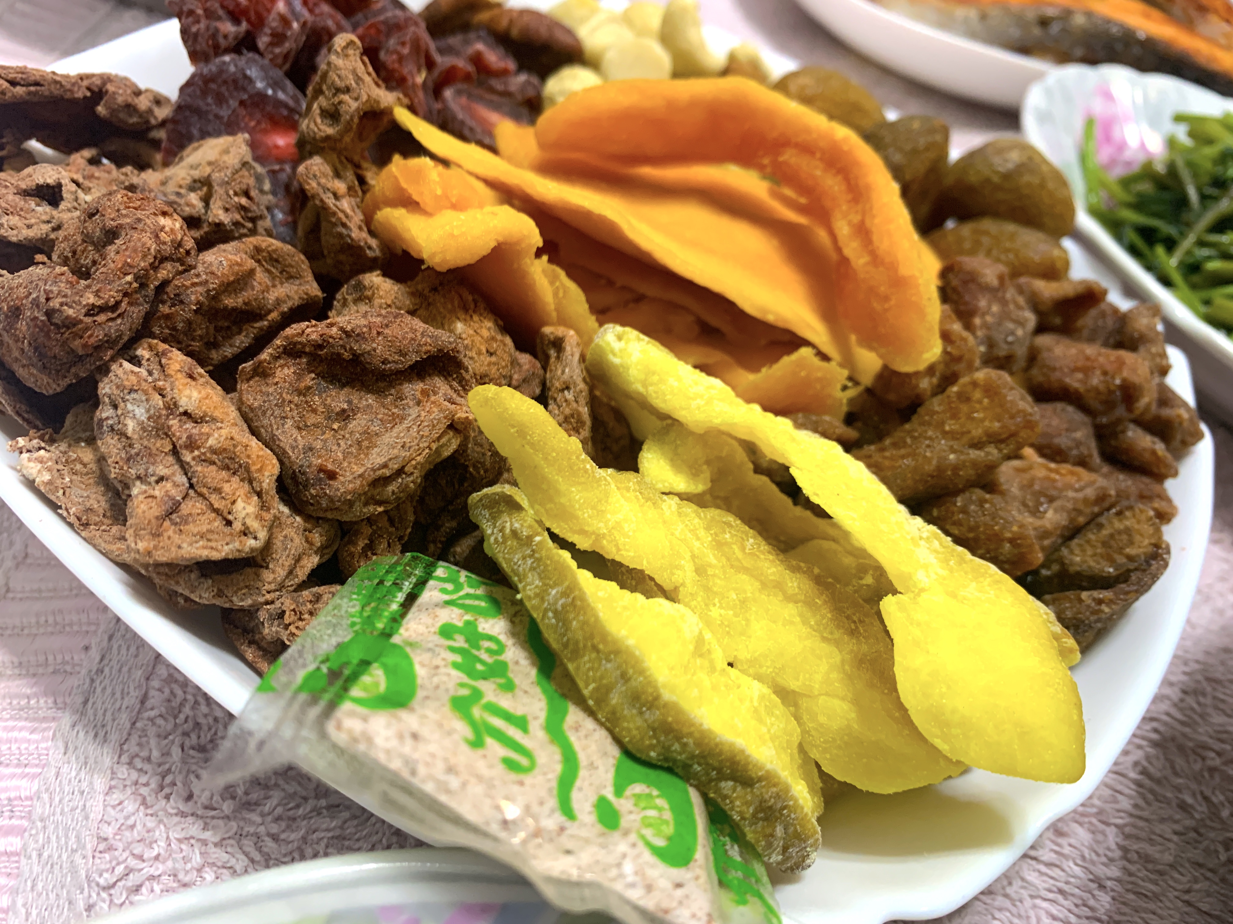 爸爸說小時候家後面中一棵青芒果樹,結果季節時,阿公會帶著爸爸,用長長的竿子採收。芒果乾之於爸爸是一種兒時回憶。