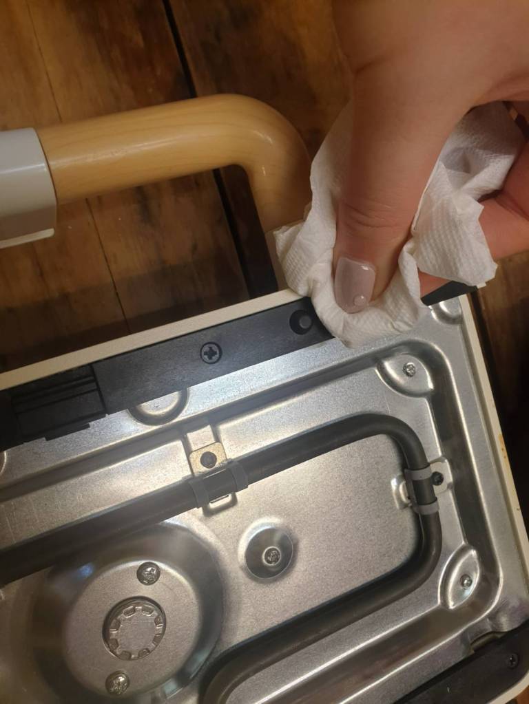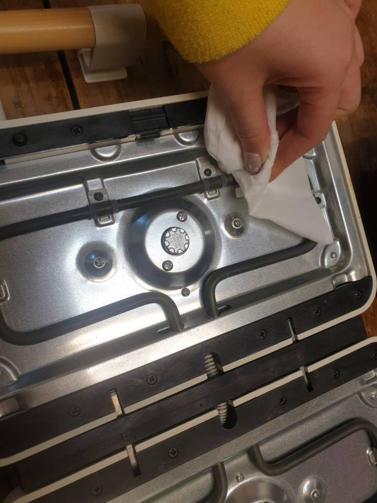 烤盤拆下後,再用紙巾擦拭內部的管線,把不小心掉入的小屑屑抓起就可以囉!
