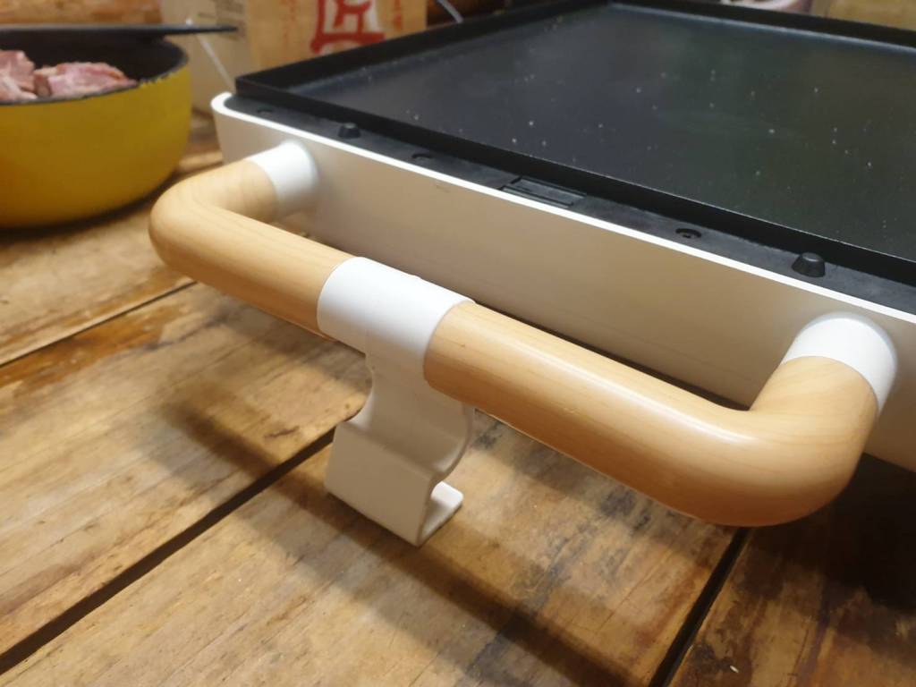 使用煎烤盤時,因為機器要固定維持180度敞開,將木把手上的扣環卡緊支撐在桌面上,會讓機器可以更安全的支撐在桌面,尤其我家的桌子不是完全的平面,這個步驟更為重要。