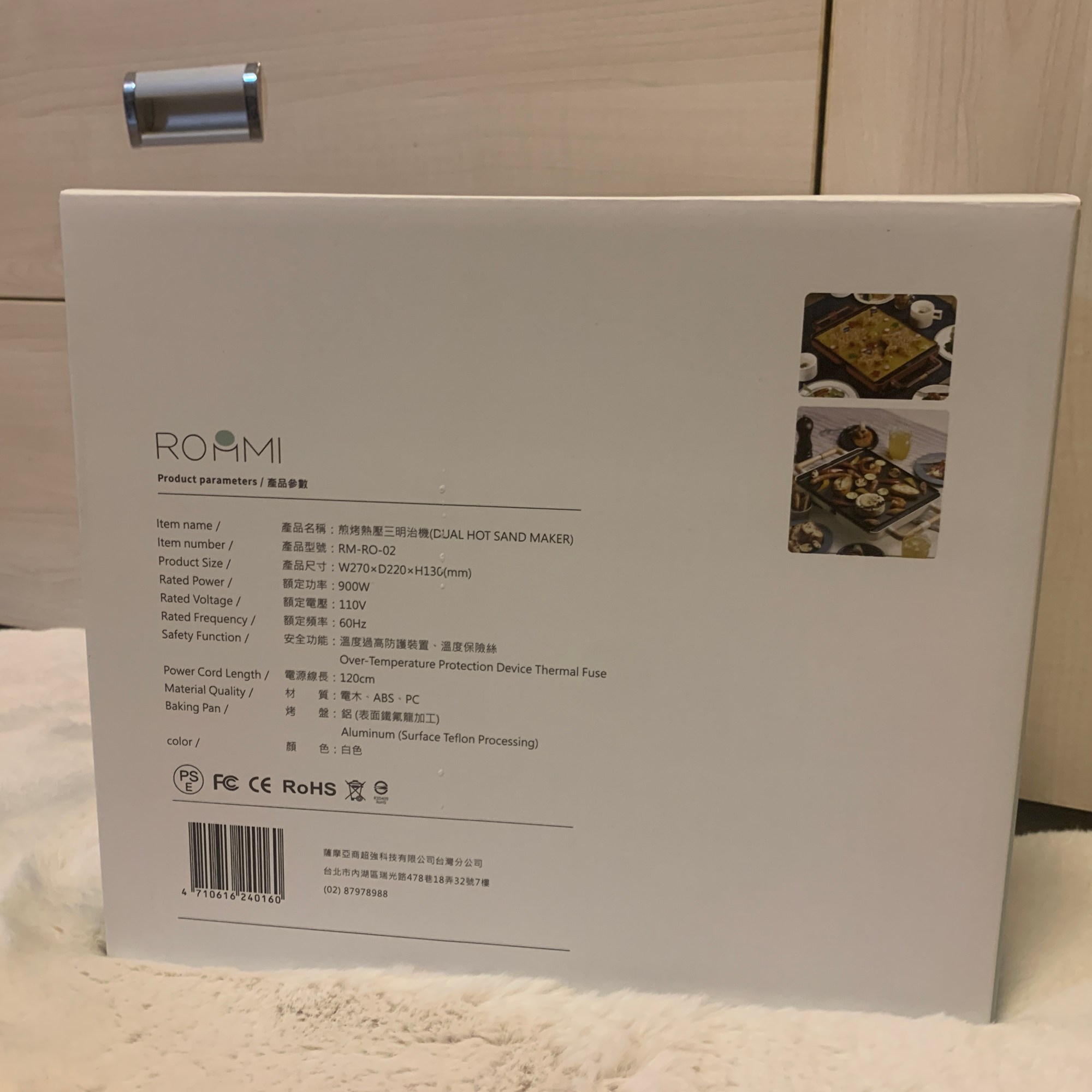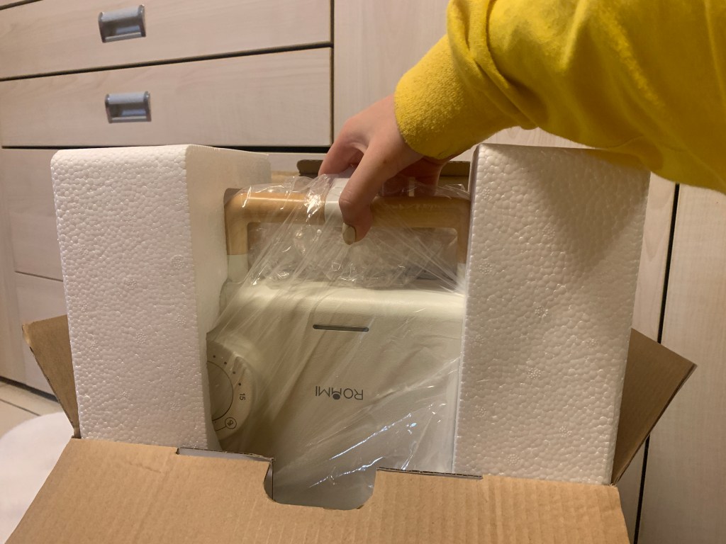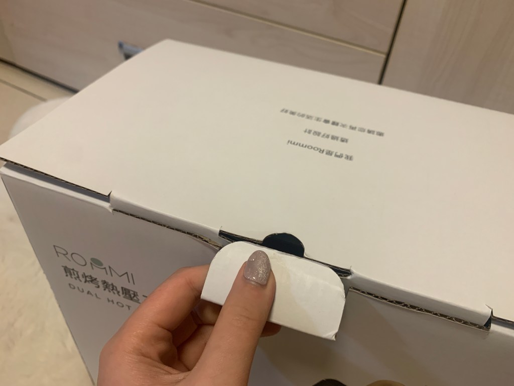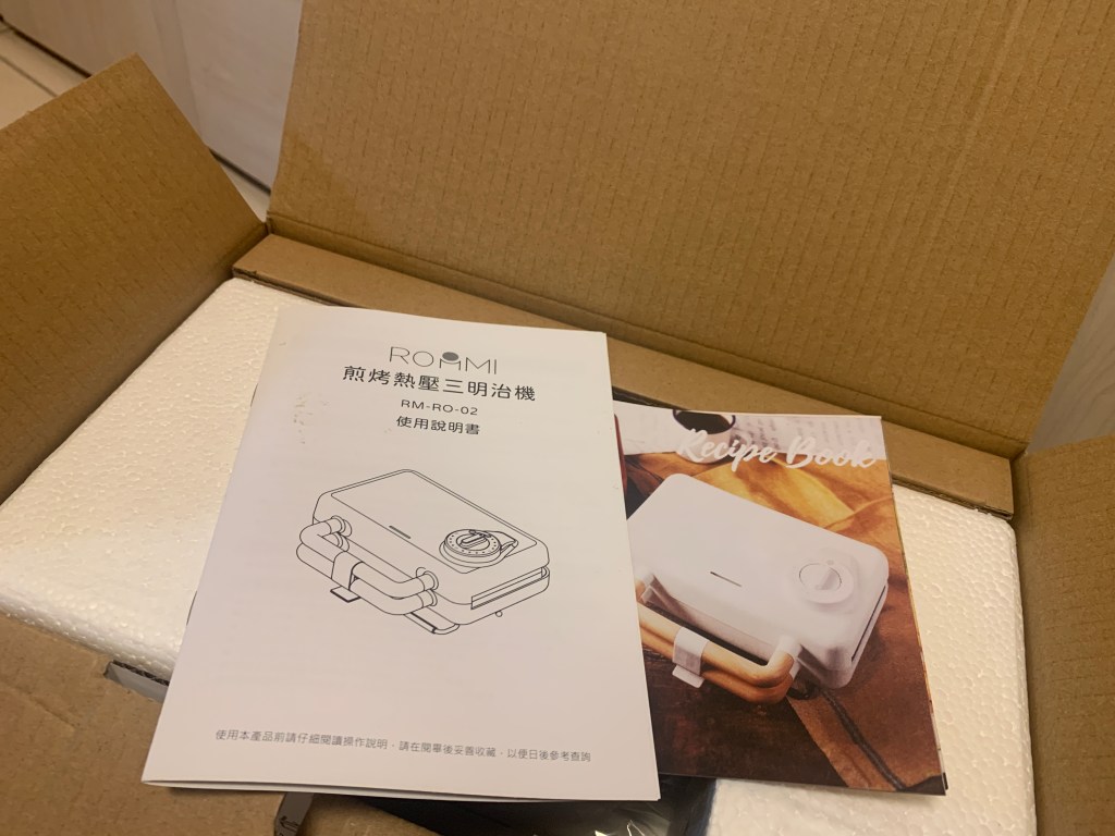 收到的包裹紙箱拆開,裡面才是產品外盒,產品會用很厚的保麗龍兩邊夾住,防止在運送中產生碰撞受損,我的Roommi煎烤熱壓三明治機是米白色的,但外觀毫髮無損唷!