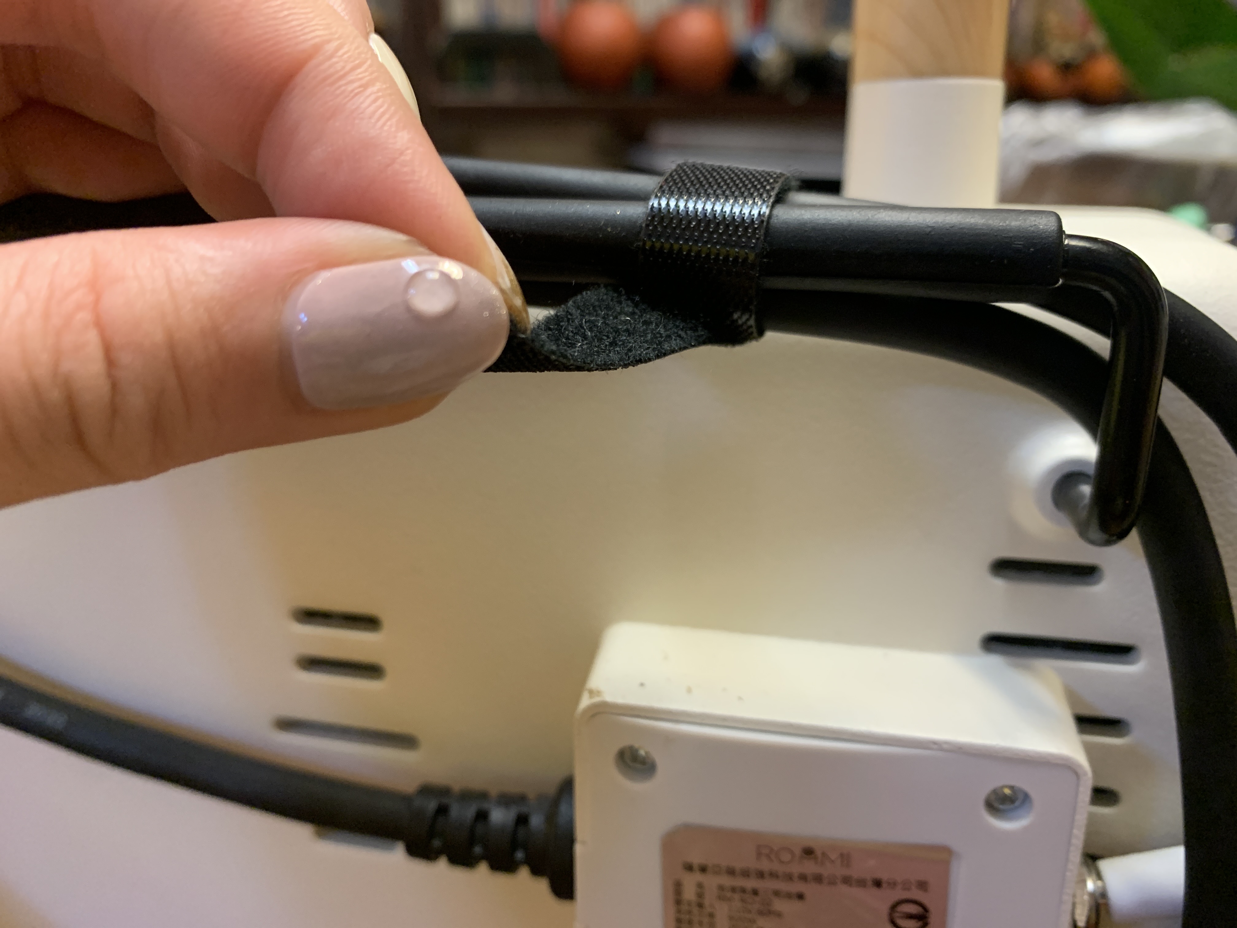 機器背後有支架,除了作為支撐、隔熱跟防滑外,還可以直接將電線纏繞上去,省去一般電器的電線,還需要額外存放空間的不便之處,使用完畢可以直接將電線繞在支架上,還附有小小的魔鬼氈可以把電線收乾淨,很貼心!將Roommi煎烤熱壓三明治機完整收妥後,機身可以垂直立放收納,節省空間