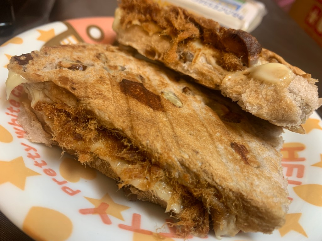 雖然是健康麵包,但這樣熱壓過後跟熱壓吐司幾乎沒什麼不同了吧!撕開過後因熱融化的起司,讓肉鬆也變得很濕潤,麵包表面用手指敲會有清脆的『叩叩』聲!而且兩面都可以均勻得受熱!