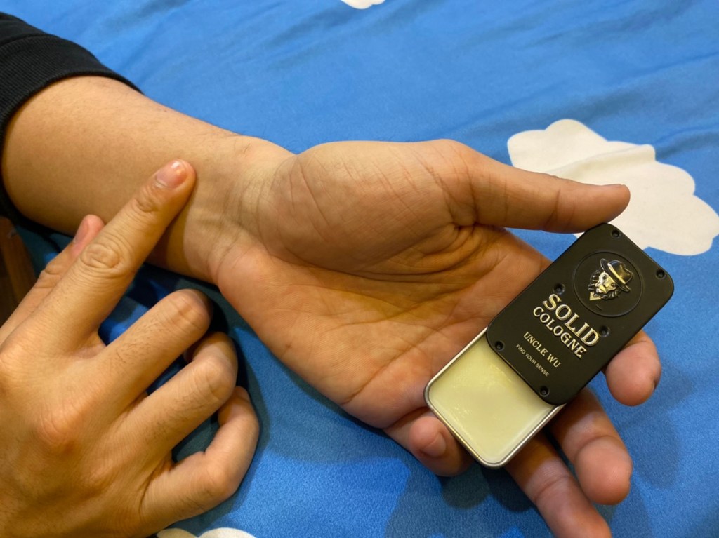 推開鐵蓋,用手指沾取適量固體香水,擦拭在手腕,Uncle Wu的9:00 p.m.無懼 2in1固體香水膏體比女生用的護唇膏等等再更firm一點,所以不會一不小心就沾太多,算是滿好控制用量的唷!