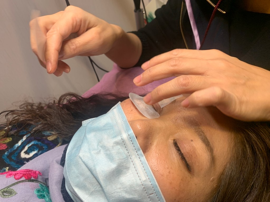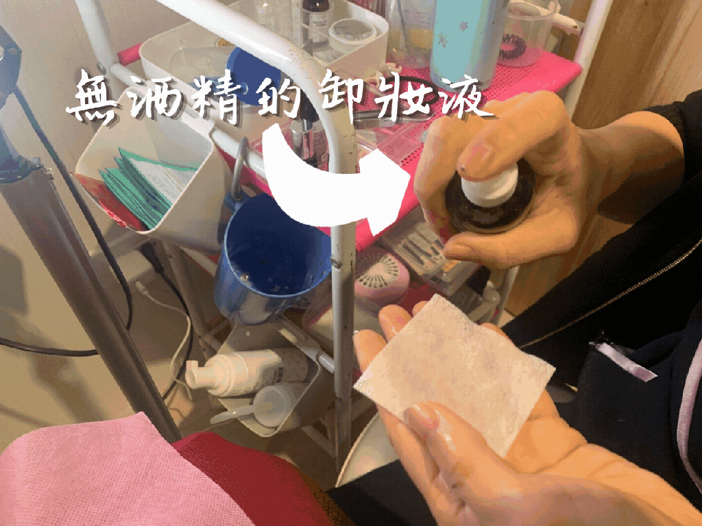 第一個步驟要先把眼部的妝卸除,包括一些眼皮上的油脂等等,方便後續的施作。雖然是施作眼睫毛的項目,但是美睫師說隱形眼鏡不用拿下來唷!