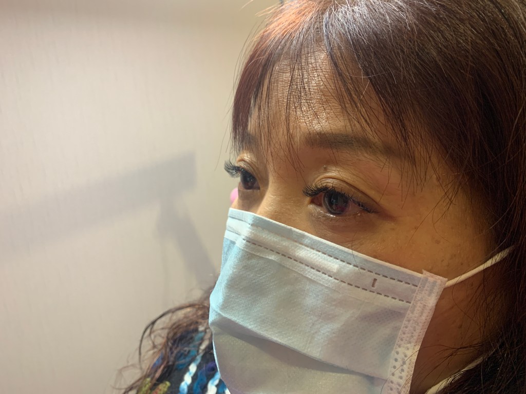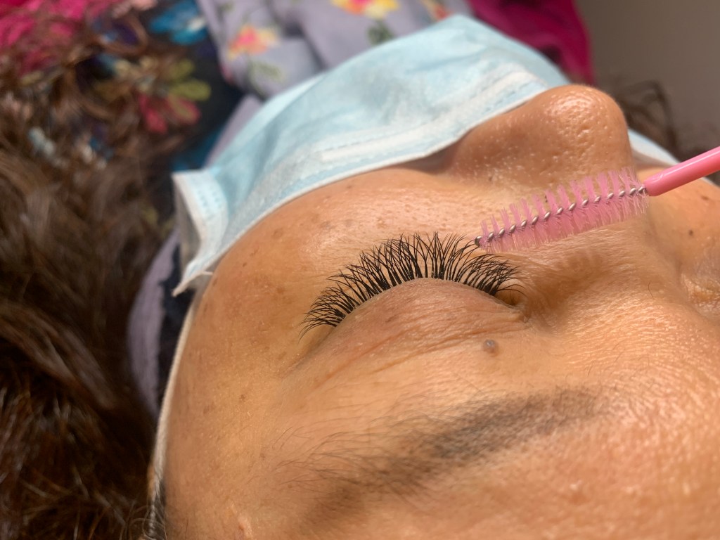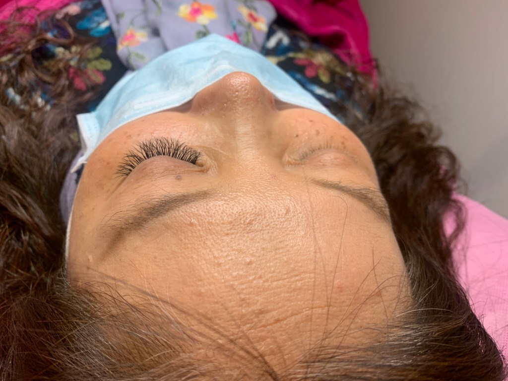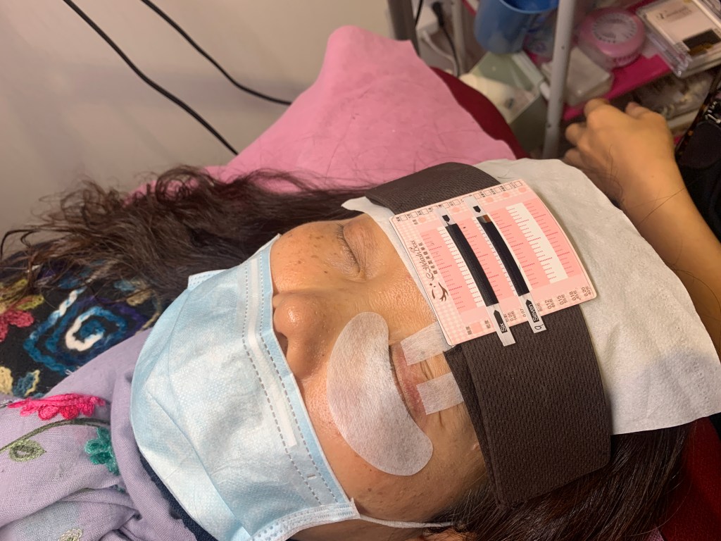 完成施作後,美睫師會提供手拿鏡確認睫毛的成品,看是否有需要微調等等。實在是好羨慕我媽的大外雙眼睛,連睫毛根部都看得清楚,看其來還有點內眼線效果。
