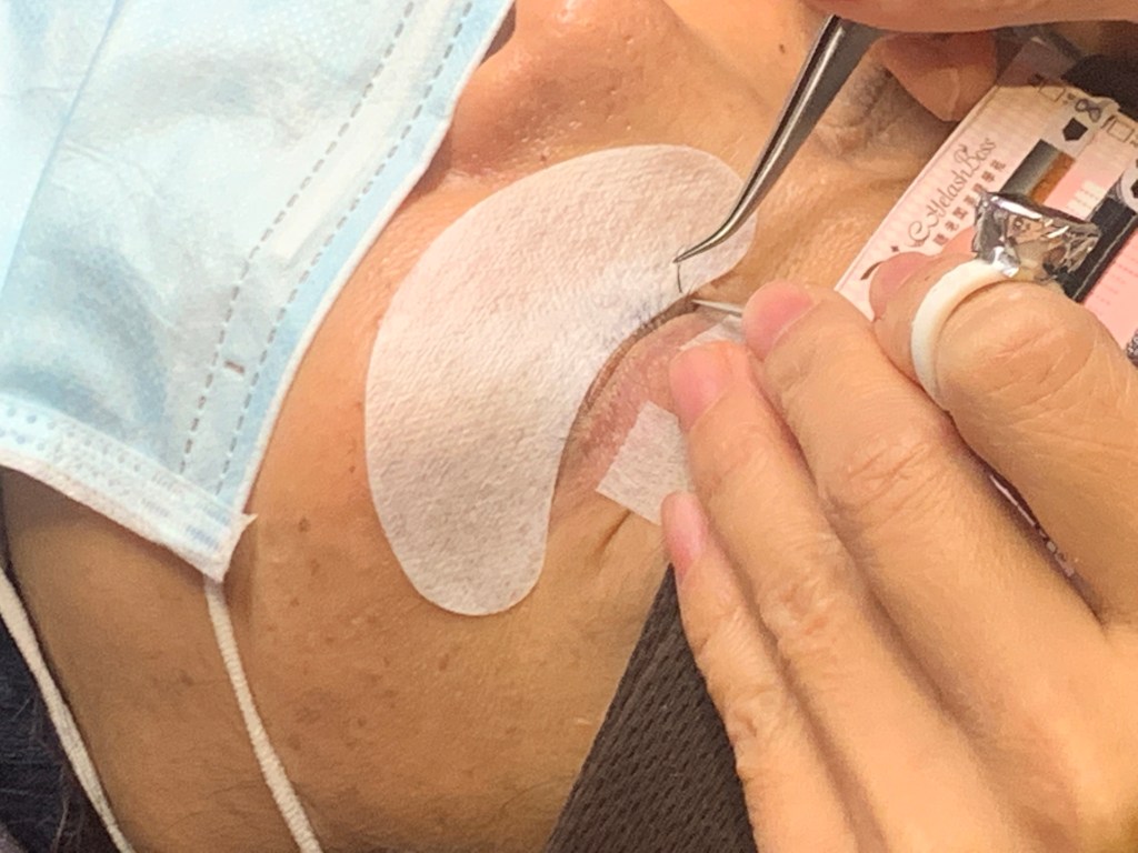 很快一邊就施作好了!美睫師會用鑷子輕柔地將透氣膠帶撕下來,並且用美睫梳把睫毛理一理,確認有沒有空隙,或是掉落的睫毛~然後就可以換另一邊囉!