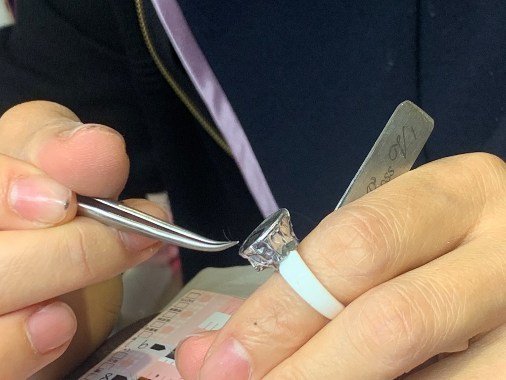美睫師超專注,我在旁邊其實也覺得很有趣,問很多睫毛相關的知識,本來我以為5D的意思是特殊材質的睫毛,經過美睫師解釋才知道原來就是睫毛尾端分岔的數量,如果本身睫毛較少的人,就可以挑選5D的款式增加濃密度。睫毛還有咖啡色的可以選唷!超特別我第一次知道!