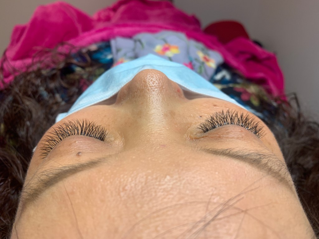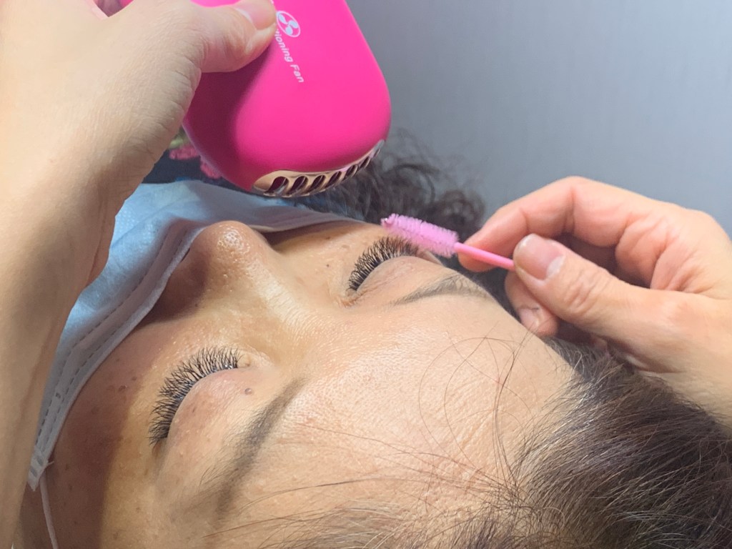 剛做完時,黏貼使用的黑膠可能尚未乾透,所以會拿小吹風機吹乾,也將睫毛整理整理,建議不要太快張開眼睛唷!黑膠尚未乾透睜開會熏眼~