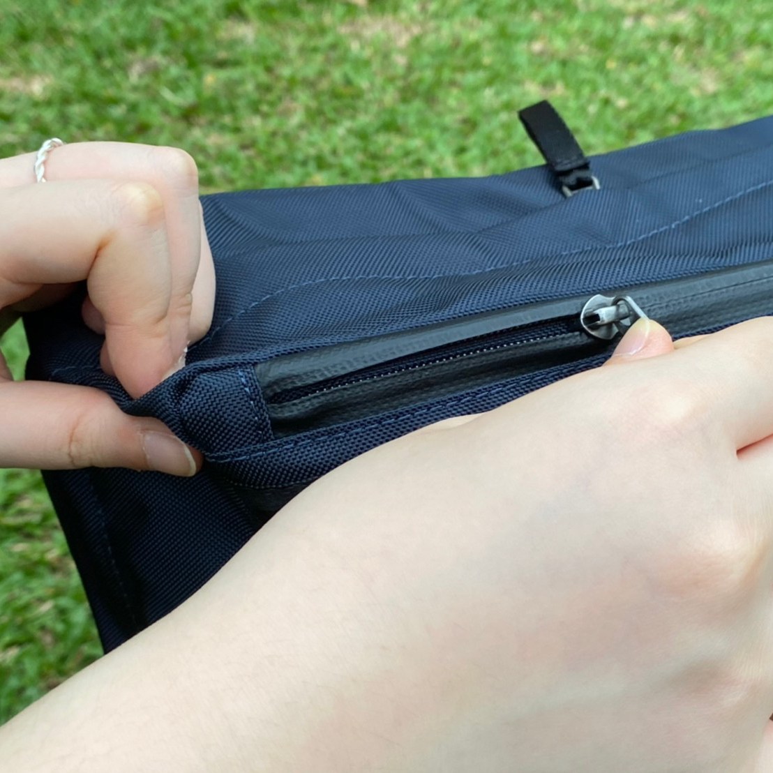 briefpack表面採用防潑水布料,可應付一般狀況,如下小雨及潑水,但還需避免長時間泡水淋大雨,依然有可能從縫隙、車縫線、拉鍊滲透唷~