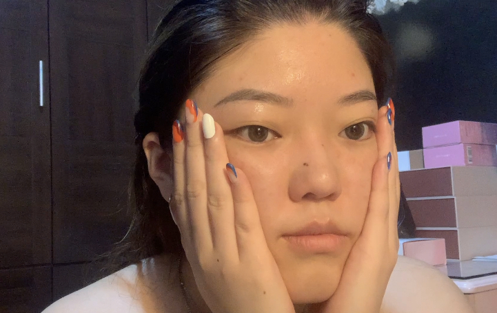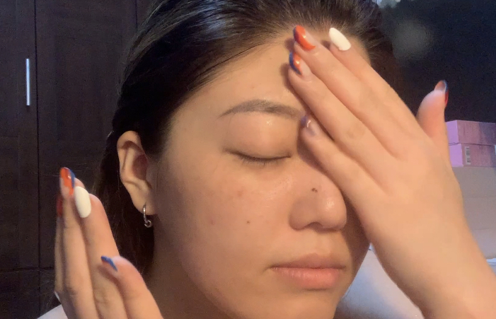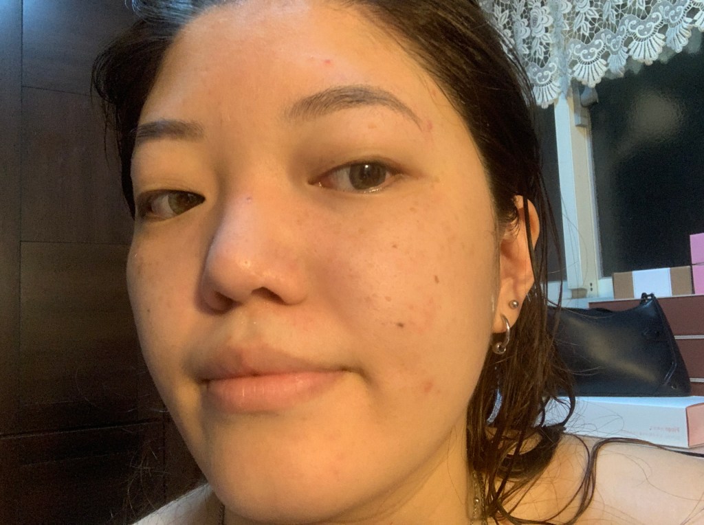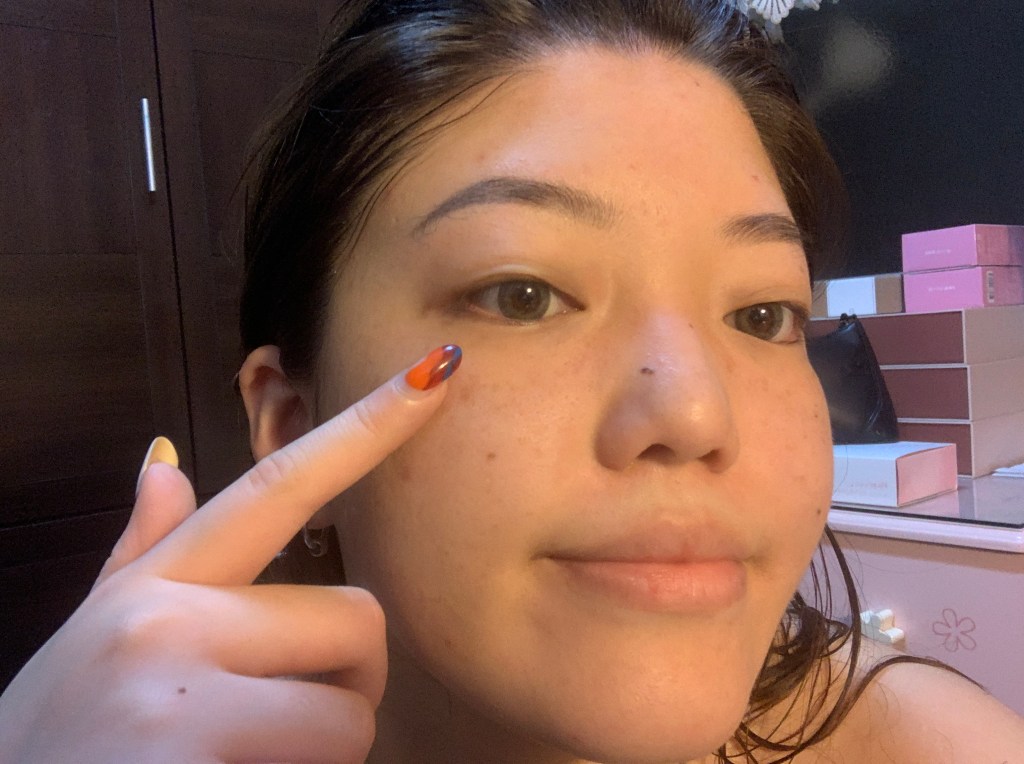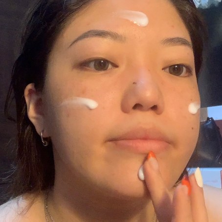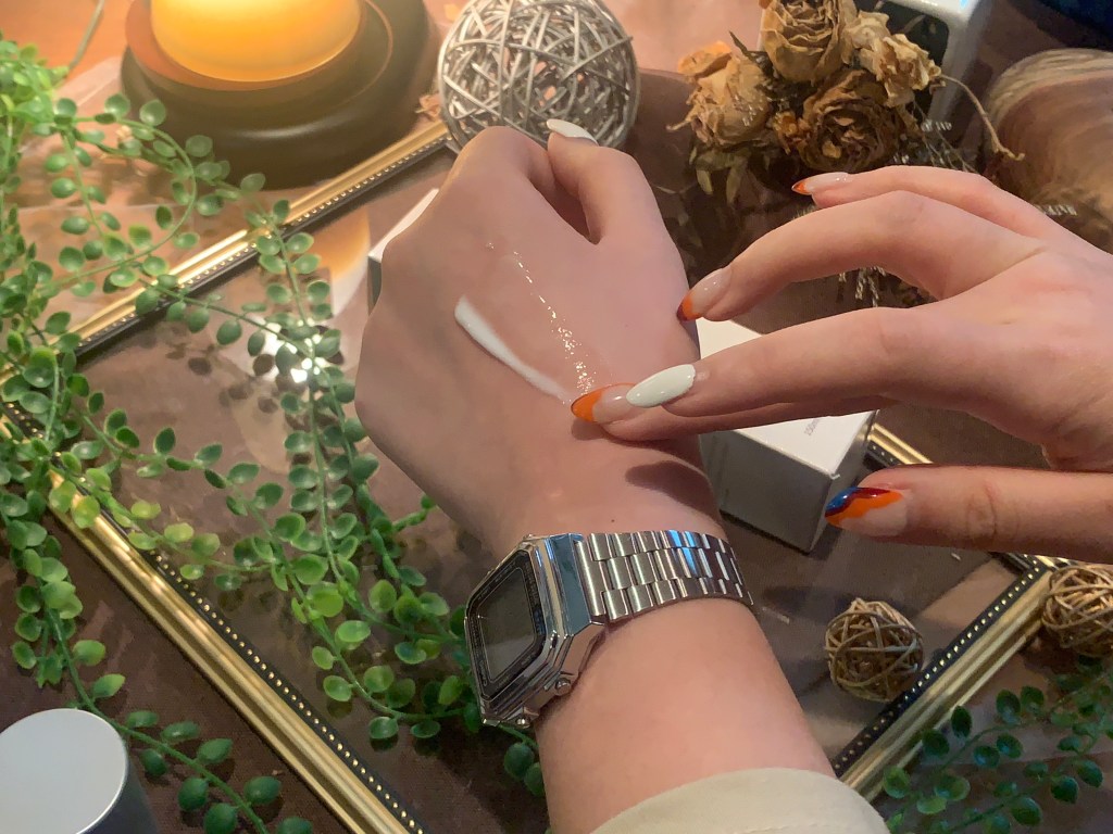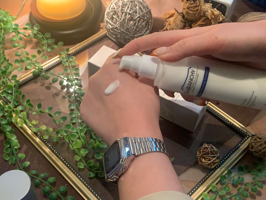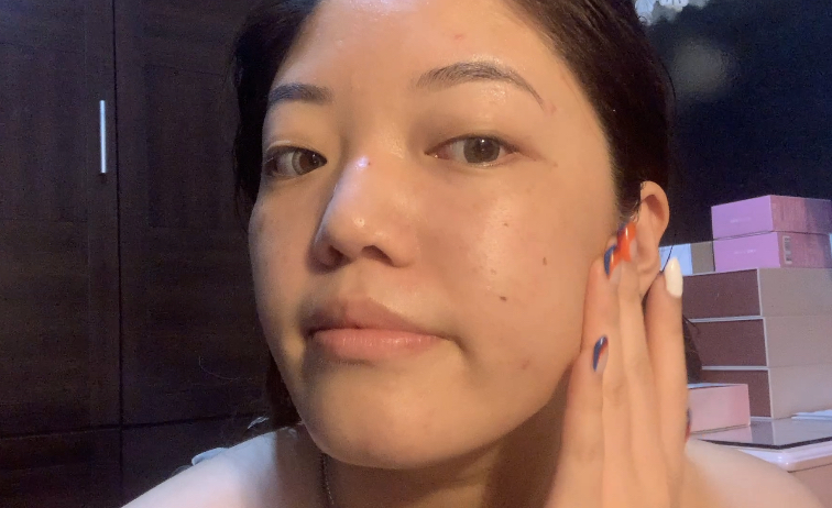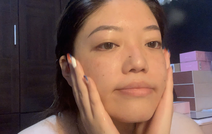 上完化妝水後,夏天的話我使用完保濕化妝水,會接著使用乳液,冬天皮膚較乾時,會在中間加上精華液的步驟~ 先點上適量在臉上,直接推開擦拭即可