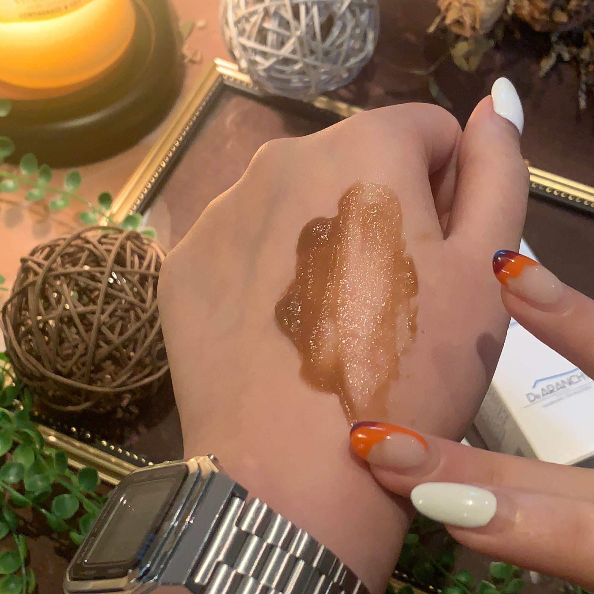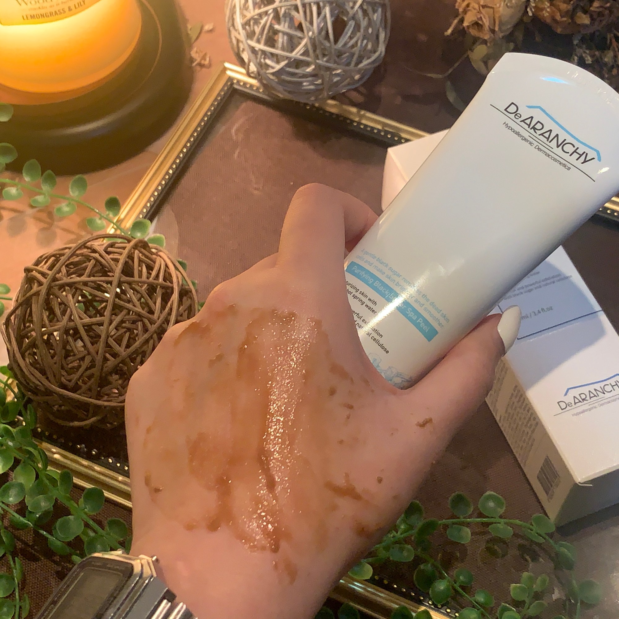 且輕微抹開可以感覺到細微顆粒感,不至於像有些身體磨砂膏中的碎核桃粒那麼有存在感,比較像是皮膚沾到細沙子的摩擦感,在搓揉過程中,不會泛紅拉扯敏感甚至疼痛,是很溫和輕柔地去角質