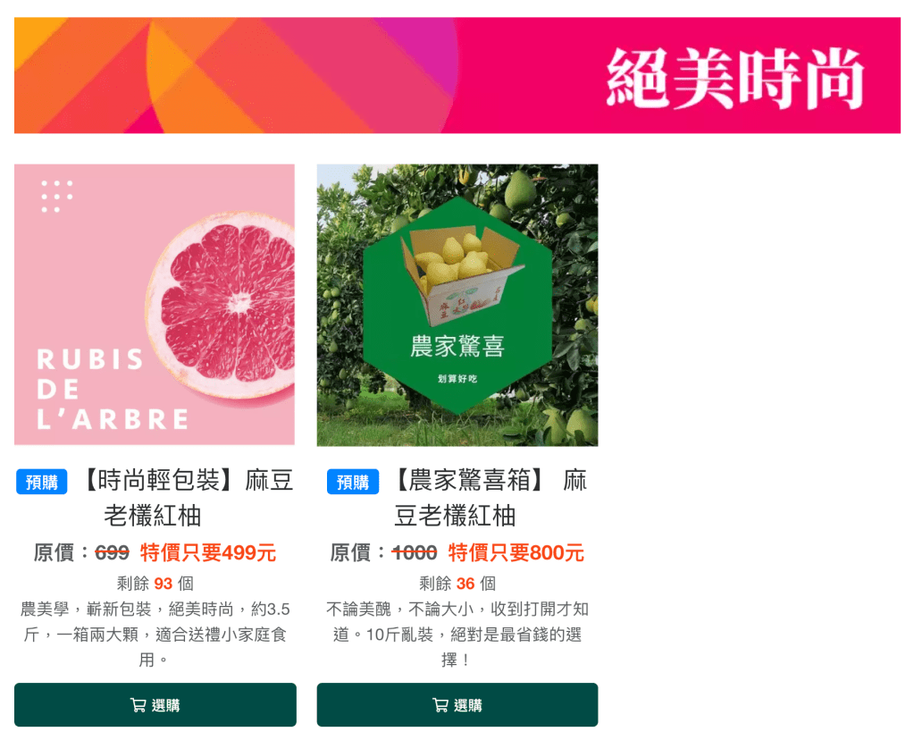訂購網站上,庄稼狼麻豆老欉紅柚分為兩種規格,〖農家驚喜箱〗及〖時尚輕包裝〗,想要最經濟實惠的選擇,可以挑選農家驚喜箱,10斤不論大小顆裝滿為止,紅柚驚喜包的概念;或者要吃就是要吃最好的,就可以像我們挑選時尚輕包裝,兩大顆頂級紅文旦